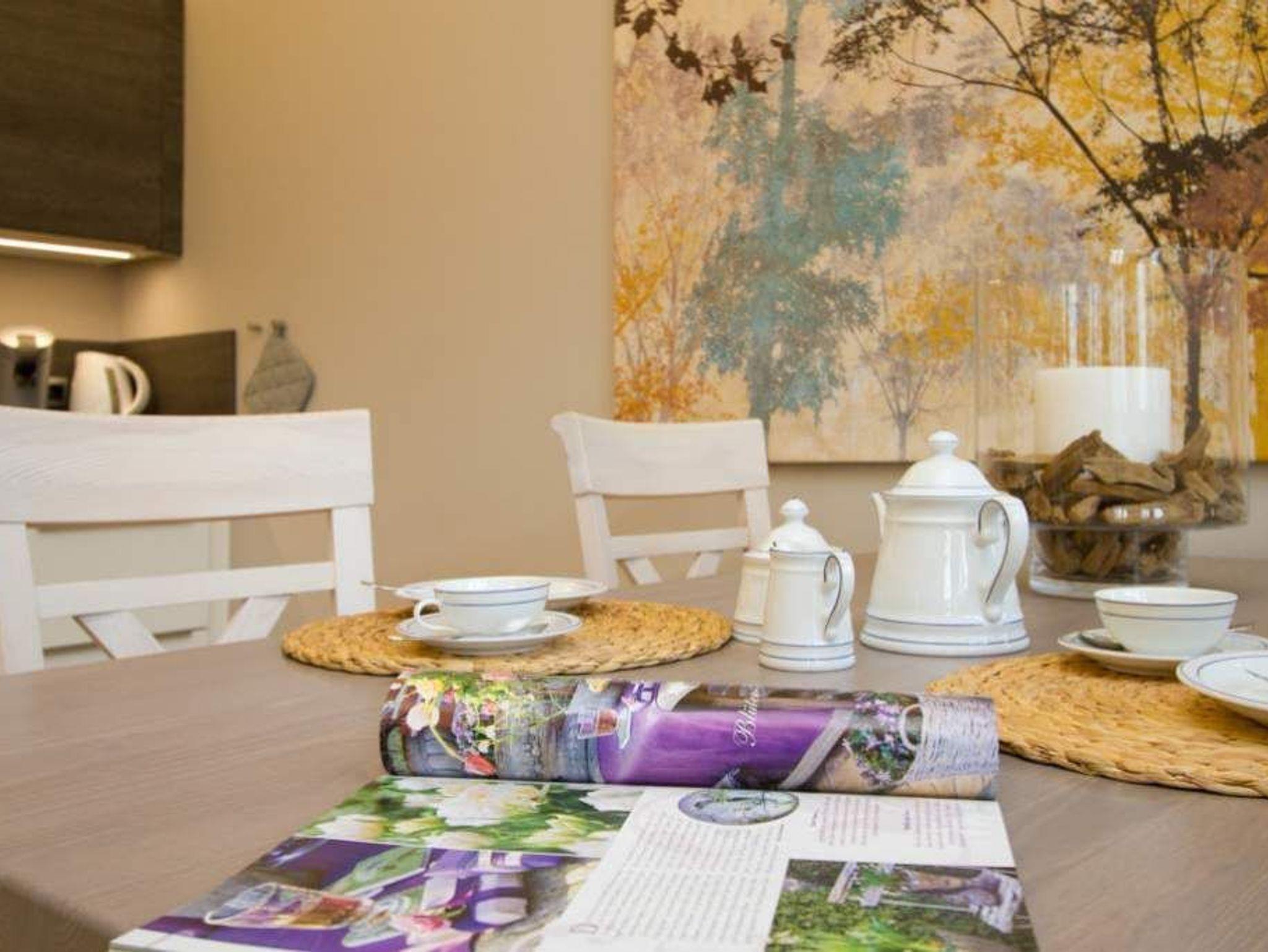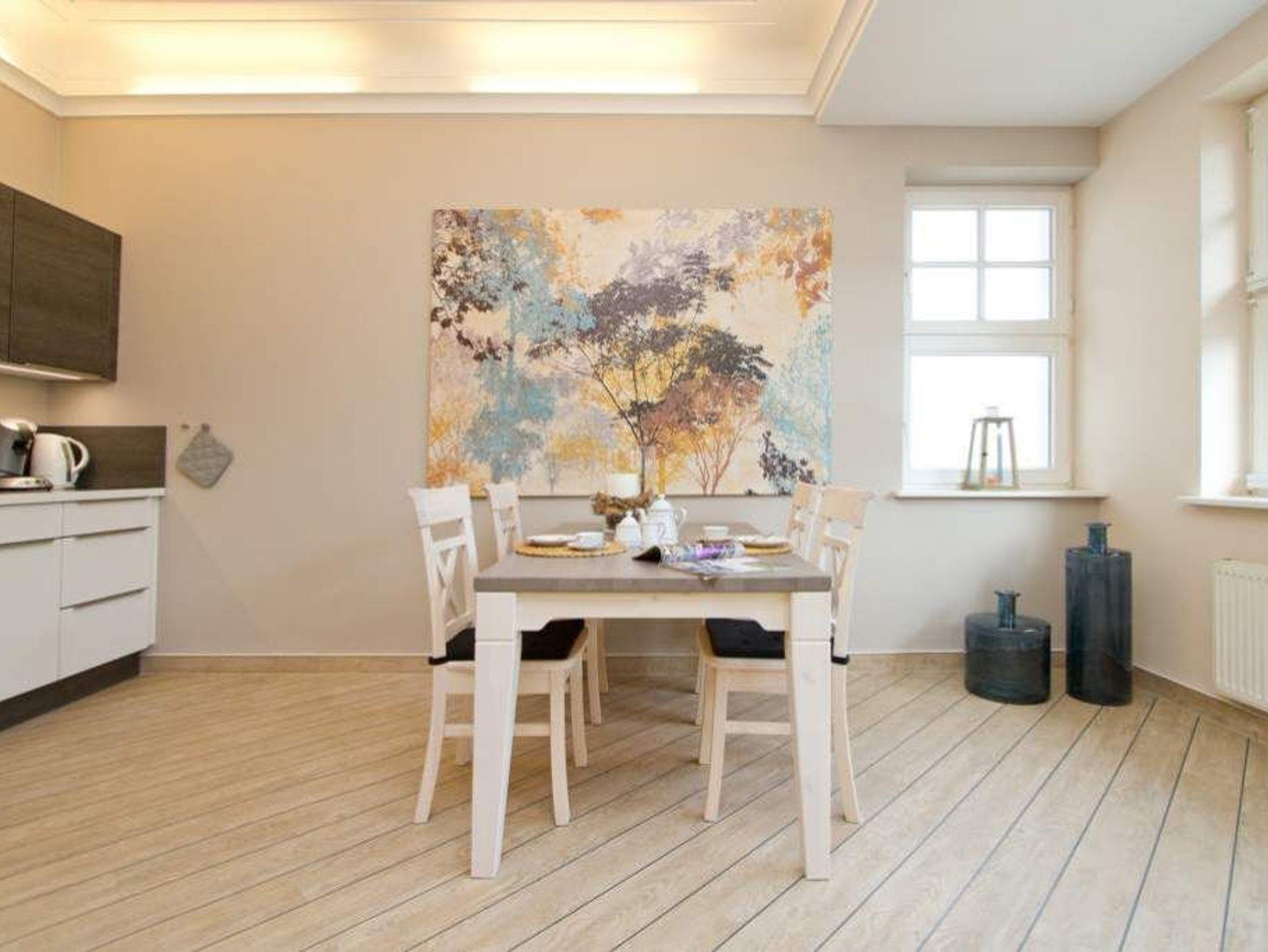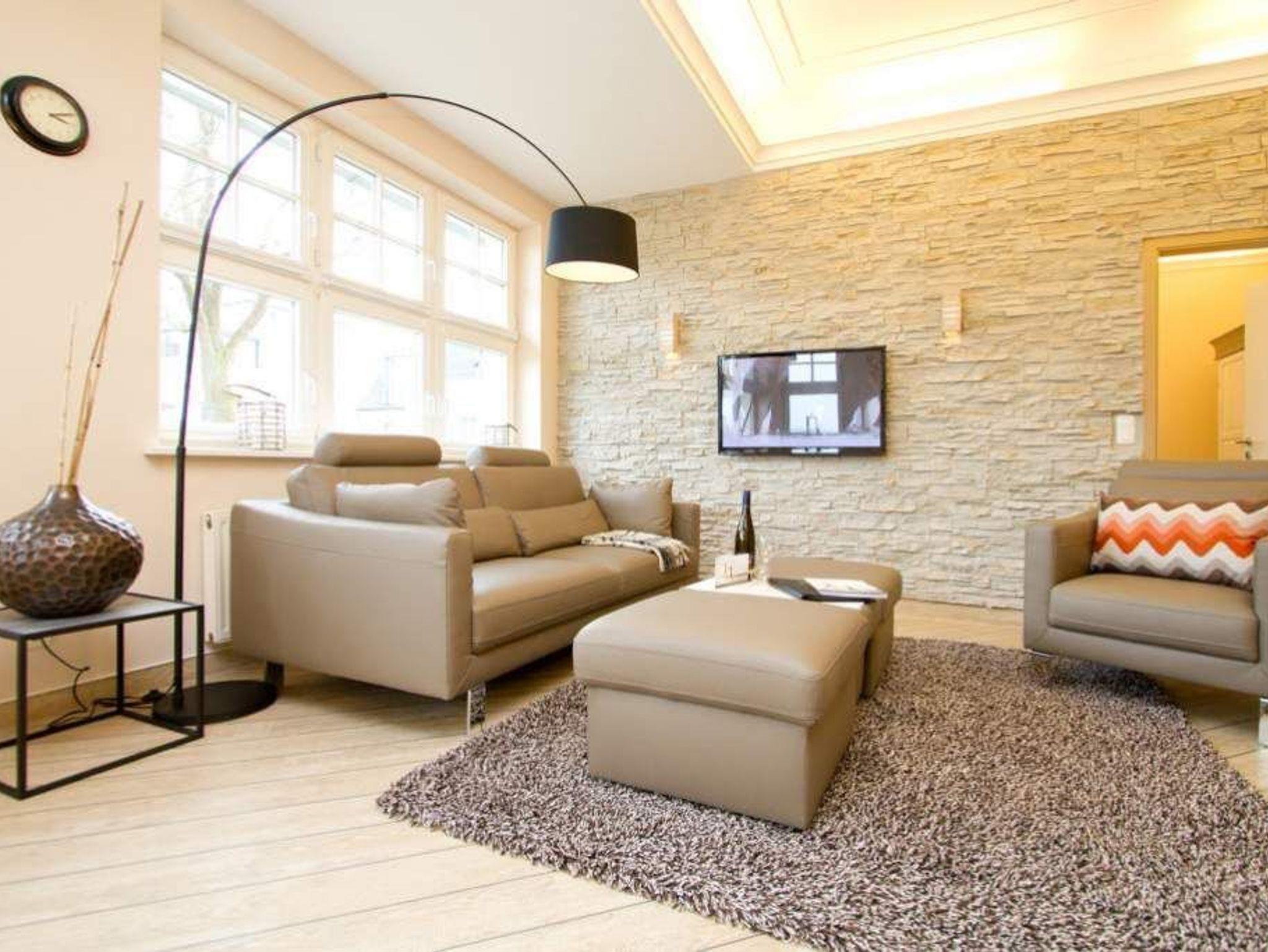 Unsere stilvolle 2-Raum-Ferienwohnung im Hochparterre des Hauses bietet auf 58 Quadratmetern ein komfortables Zuhause für zwei Erwachsene und ein Kleinkind bis zu zwei Jahren im Kinderreisebett. Die moderne Einrichtung und die geschmackvolle Dekoration mit harmonisch abgestimmten Farben und Stoffen sorgen für ein einladendes Ambiente, in dem keine Wünsche offenbleiben. Der lichtdurchflutete Wohnbereich ist mit einer gemütlichen Ledersitzgruppe und einem Flat-TV ausgestattet und geht nahtlos in die offene Küche mit Essbereich über. Von hier aus genießen Sie einen schönen Blick auf die Promenade und die Ostsee. Das großzügige Schlafzimmer überzeugt mit einem komfortablen Boxspringbett (1,80 m x 2,00 m) sowie einem weiteren Flat-TV. Das moderne Badezimmer verfügt über eine Dusche und ein WC. Für unsere kleinen Gäste stellen wir auf Wunsch ein Kinderreisebett (ohne zusätzliche Matratze und Bettzeug) sowie einen Kinderhochstuhl gegen einen Aufpreis bereit. Damit Sie sich vom ersten Moment an wohlfühlen, sind die Betten bei Ihrer Anreise bereits bezogen und frische Handtücher liegen für Sie bereit. Bitte beachten Sie, dass kein PKW-Stellplatz zur Verfügung steht.