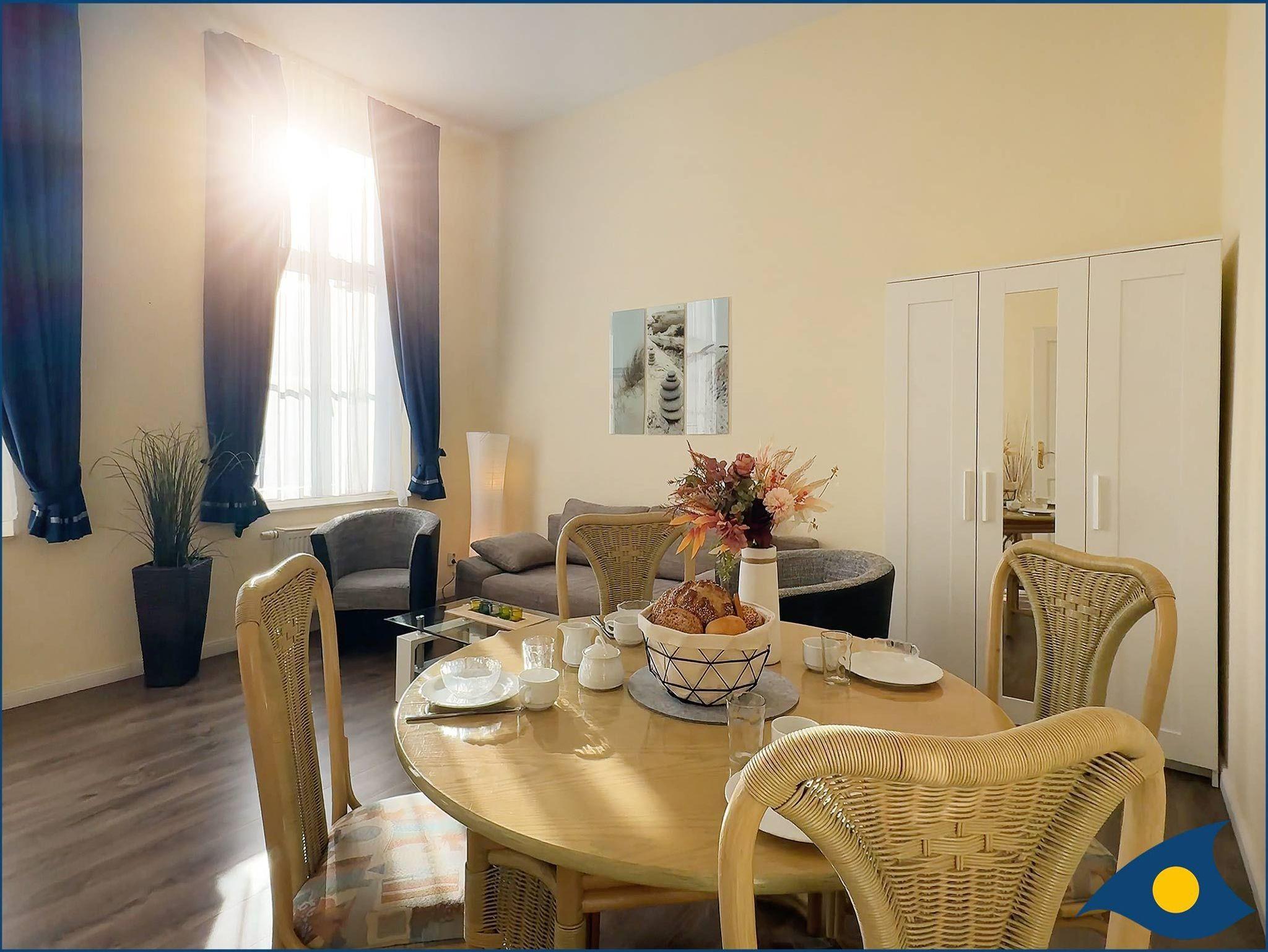 Die Wohnung besteht aus einem geräumigen Wohn- und Esszimmer (inkl. einer Aufbettungsmöglichkeit für 2 Kinder bis 10 Jahre auf der Schlafcouch) und einem separaten Schlafraum. Die separate Küche verfügt über einen Kühlschrank mit Kühlfach, einer Spülmaschine und einem Herd. Zur Ausstattung gehören außerdem SAT-TV, Radio, DVD- und CD-Player.