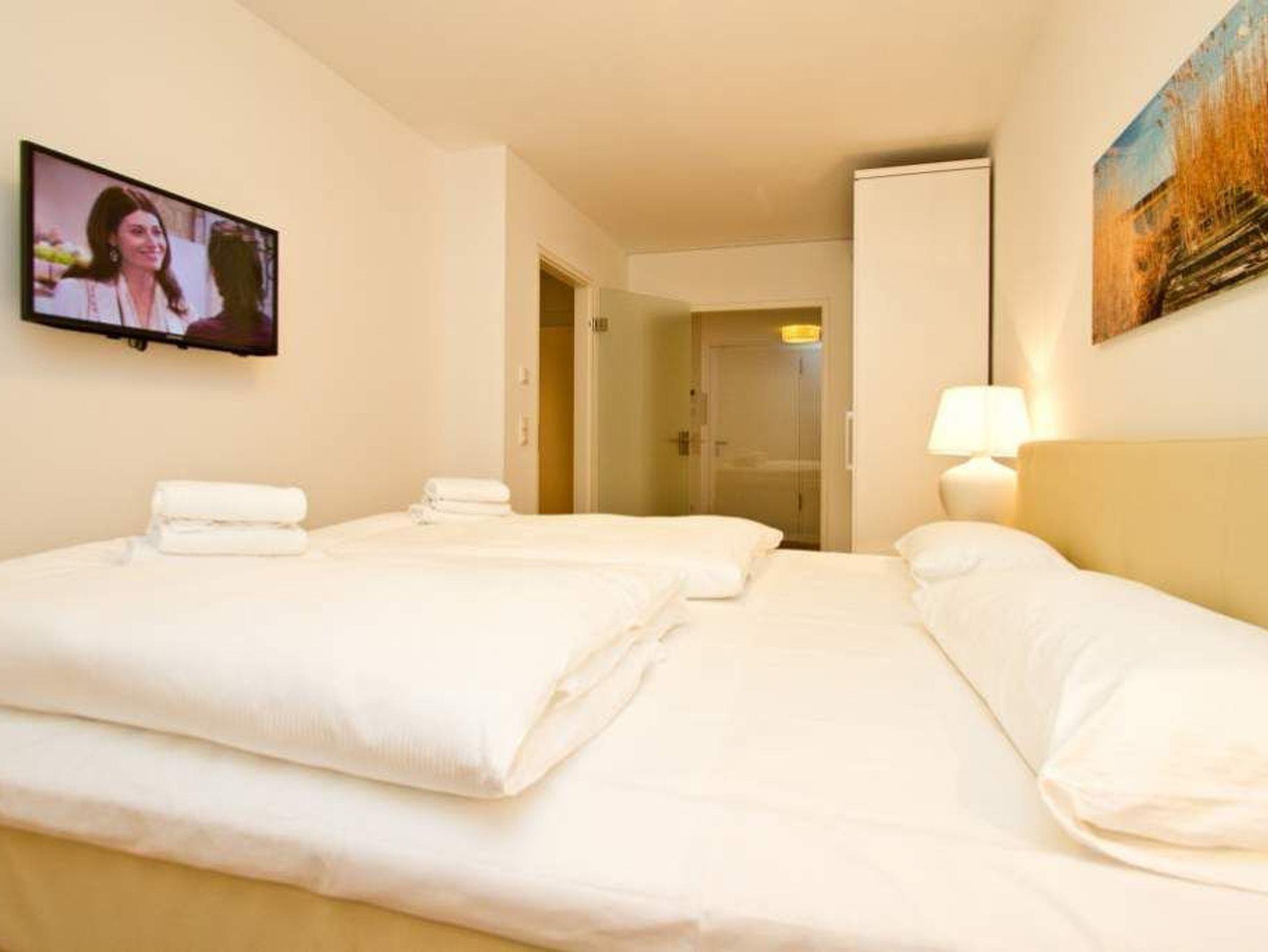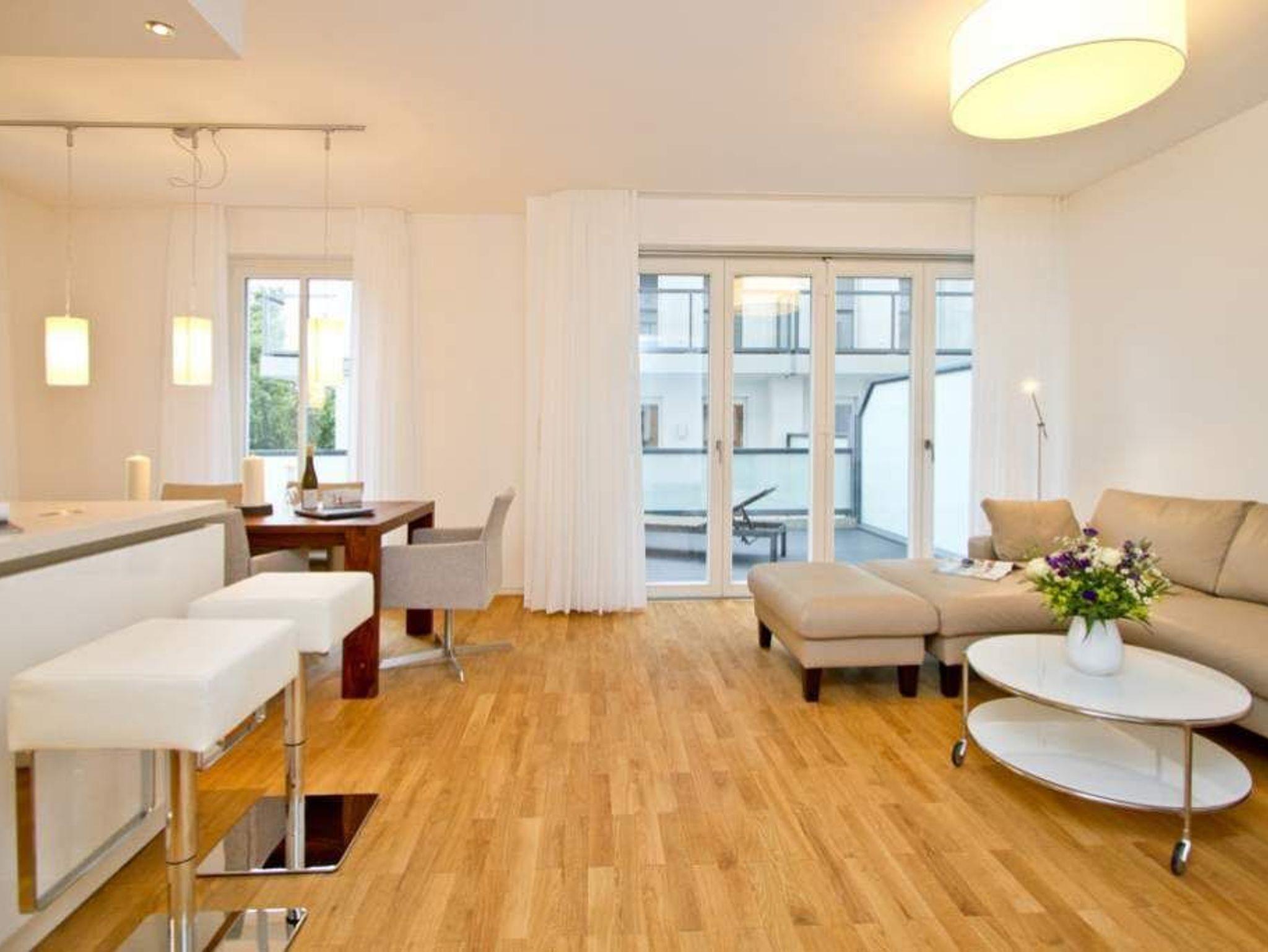 Sonnige Aussichten verspricht die Ferienwohnung 1 im Erdgeschoss des Ostseepalais. Geschützt hinter dem Dünenbereich erwartet Sie hier eine riesige Sonnenterrasse mit Strandkorb und ein großzügiges 4-Raum-Appartement (120qm) mit toller, moderner Einrichtung! Ausgestattet für 6 Erwachsene und 2 Kleinkinder (bis 3 Jahre im Kinderreisebett) finden Sie einen hellen Wohnbereich ausgestattet mit bequemer Ledercouch, Flat-TV und Elektrokamin. Die angrenzende, offene Küche ist mit allem Komfort ausgestattet und der große Esstisch lädt nicht nur zum ausgiebigen Frühstücken ein. Die 3 Schlafzimmer sind mit Doppelbetten und Einbauschränken mit viel Platz ausgestattet. Zwei Schlafzimmer führen auf die umlaufende Terrasse, ein Schlafzimmer ist innenliegend (wie auch die Bäder). Ein besonderes Highlight ist die wohnungseigene Sauna im großen Bad. Hier gibt es eine Badewanne und eine große Dusche. Ein zusätzliches Bad verfügt über eine Dusche. Für Ihren Komfort ist die Erstausstattung Wäsche inklusive. Auf Wunsch stellen wir ein Kinderreisebett und einen Kinderhochstuhl gegen einen Aufpreis zur Verfügung. Zwei Stellplätze befinden sich in der Tiefgarage. Das Wlan-Netz in der Wohnung ist kostenlos nutzbar-bitte fragen Sie an unserer Rezeption.