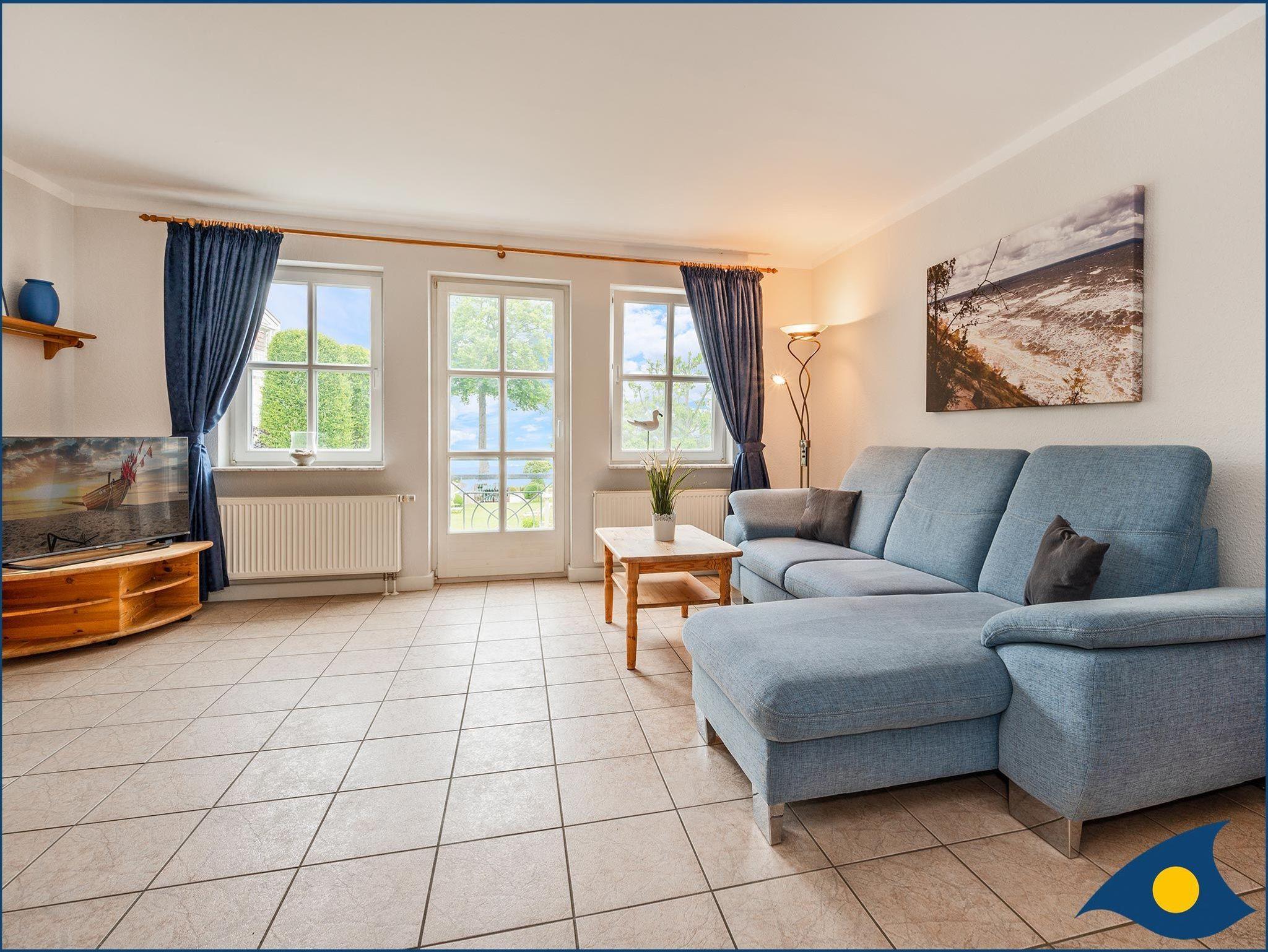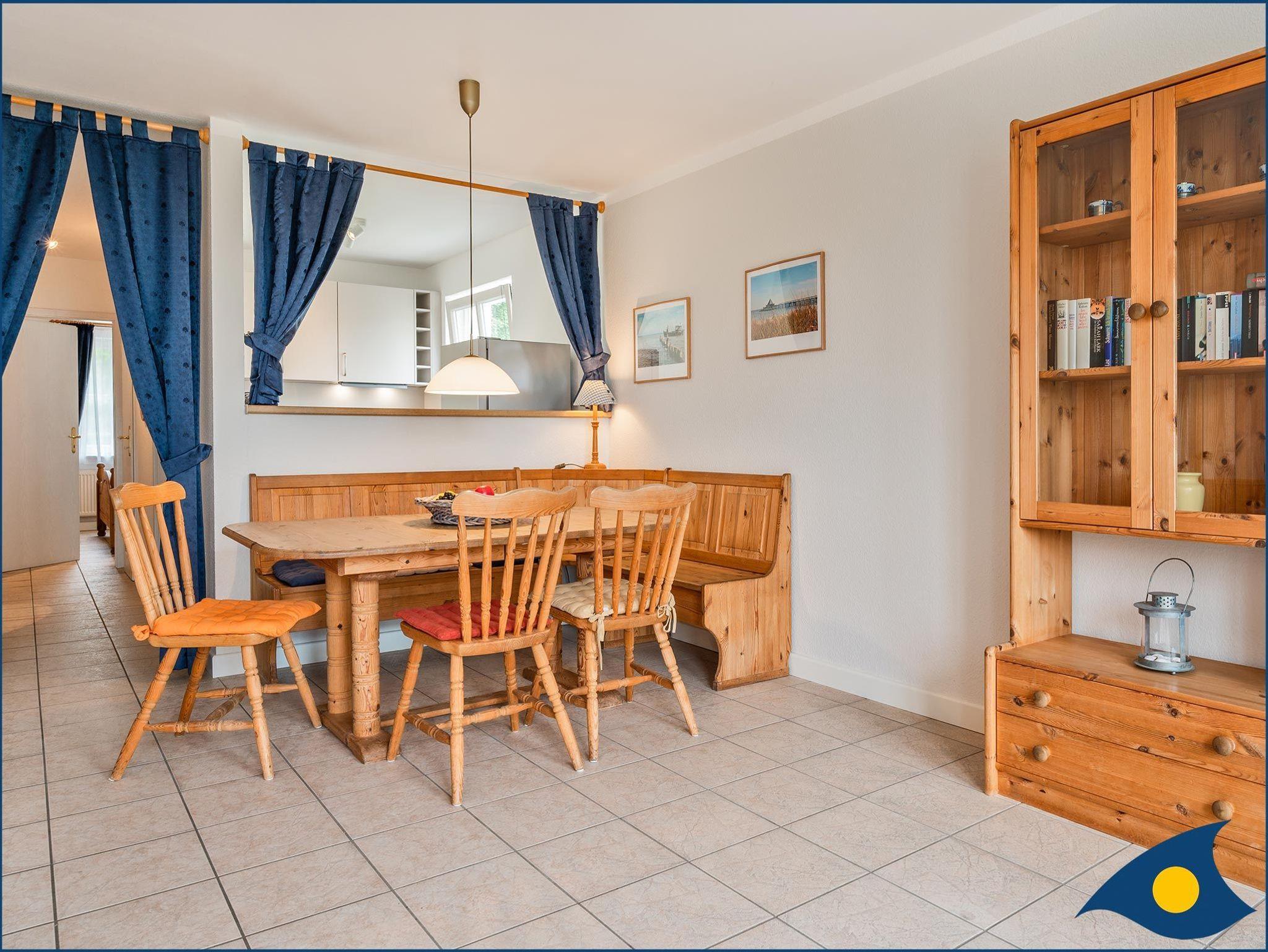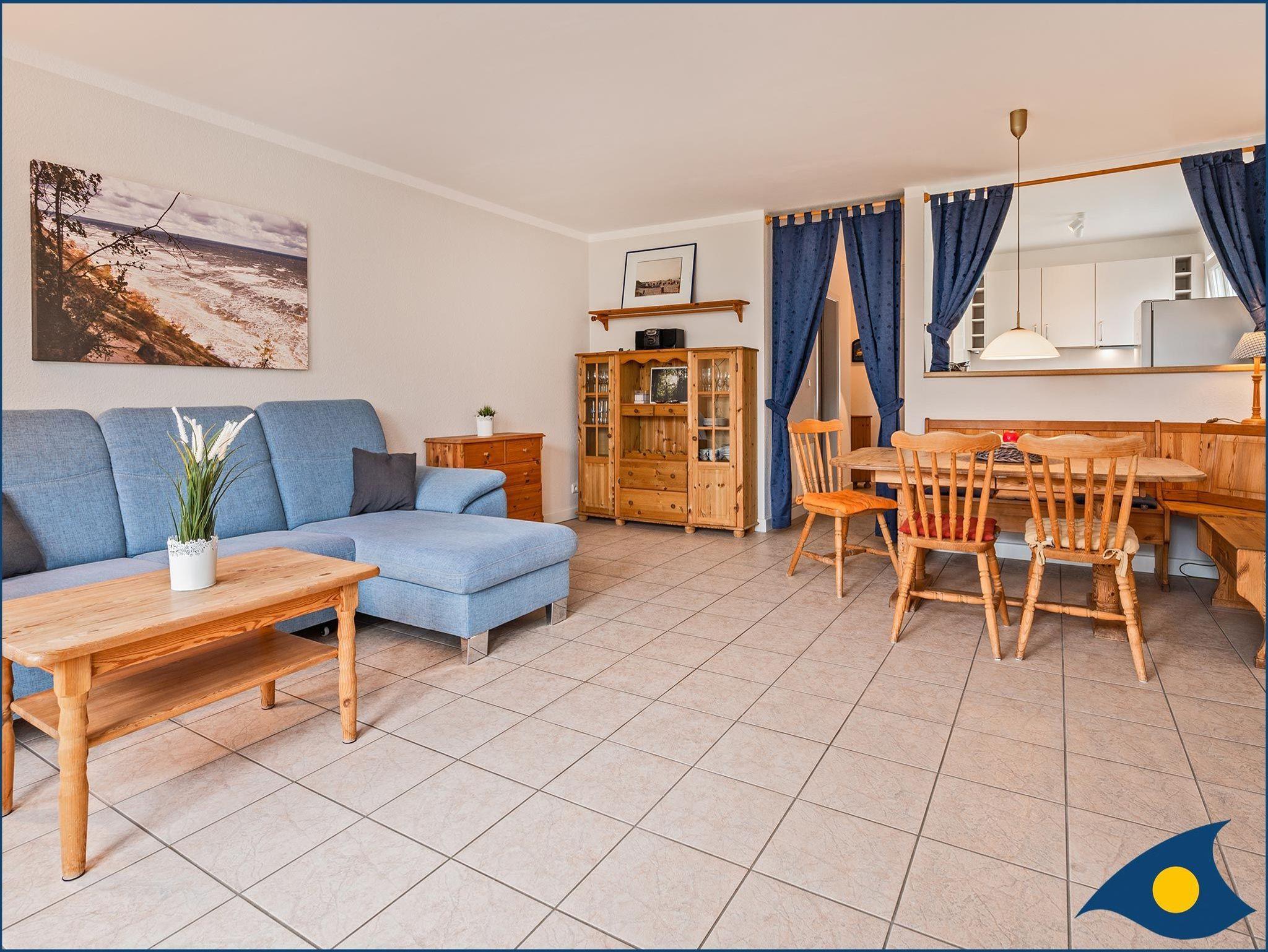 Auf 56 m² Wohnfläche erwartet Sie ein großzügiger und heller Wohnraum. Das bequeme Ecksofa lädt zu gemütlichen Fernsehabende oder einem Mittagsschläfchen inkl. Meeresrauschen ein. Die Essgruppe, bestehend aus Bänken, Tisch und Stühlen bietet genügend Platz für ein gemeinsames Abendbrot mit Freunden. In der separaten Küche mit einer Durchreiche zum Wohnzimmer bereiten Sie das morgendliche Frühstück zu oder kochen Ihr Lieblingsessen.