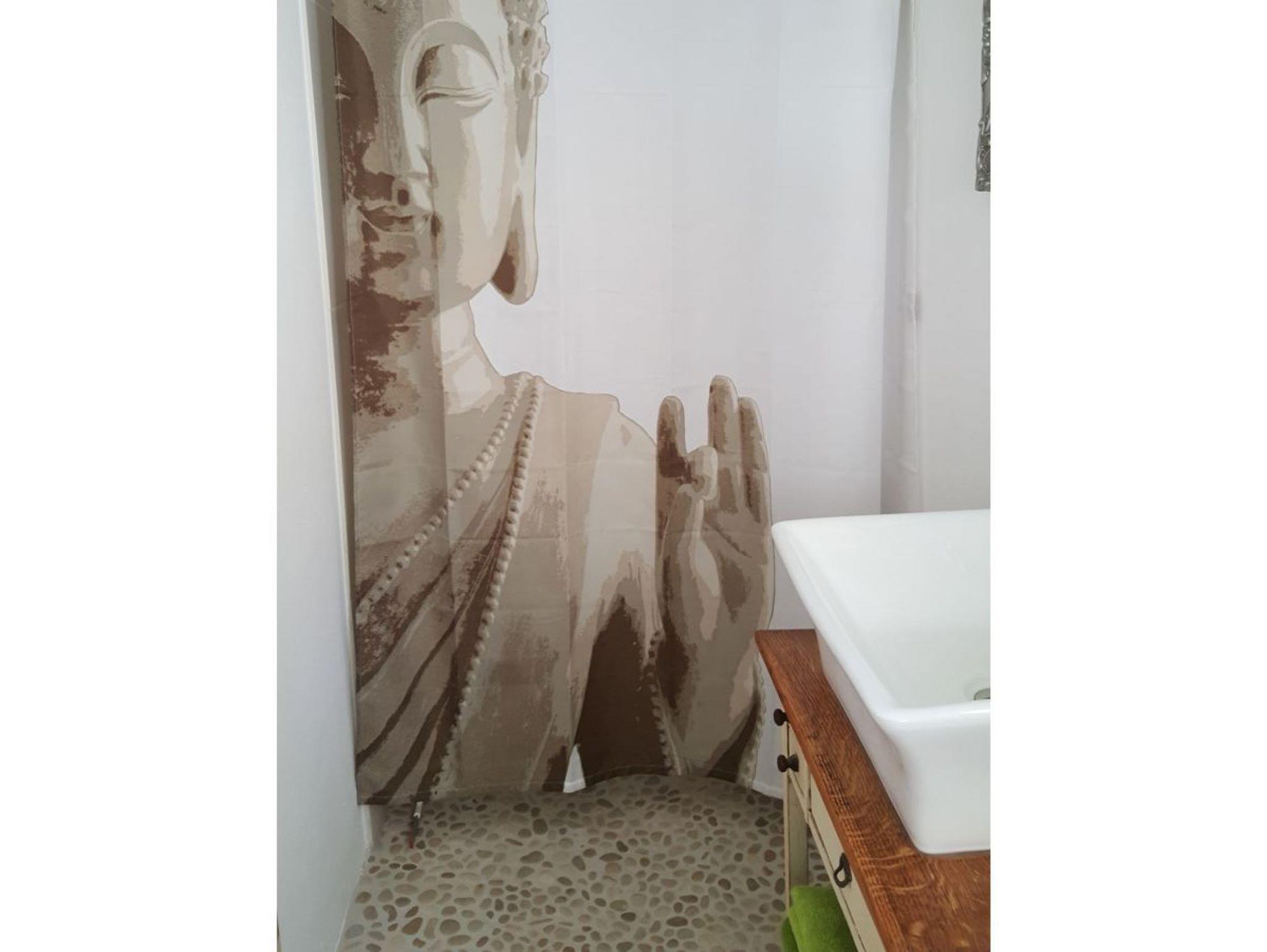 Das Bad besitzt eine geräumige ebenerdige Dusche.