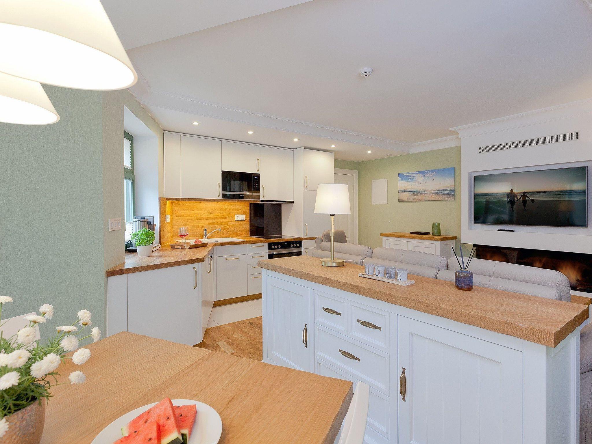 Ein großzügiger Wohnbereich mit einem exklusiven Gaskamin erwartet Sie bereits, sodass Sie eine angenehme Wohlfühlatmosphäre das gesamte Jahr über genießen. Eine bequeme Couchgarnitur und ein Flat TV runden den Komfort perfekt ab und laden zum Entspannen und Füße hochlegen ein. Das helle Zwei-Zimmer-Appartement hat eine Größe von 60 Quadratmetern und liegt im Gartengeschoss der Villa Waldschloss. Die vollausgestattete Küche, welche speziell von einem einheimischen Tischler angefertigt wurde, ergänzt die Annehmlichkeiten dieses neuen Appartements mit allen Raffinessen: Backofen, Mikrowelle, Kühlschrank mit Gefrierfach, Toaster, Wasserkocher, Kaffeemaschine sowie einem Essplatz für 4 Personen. Dem Rauschen der Ostsee können Sie bereits von Ihrer Sonnenterrasse im Grünen lauschen. Echtholzparkett im Wohn- und Schlafraum, unkaputtbare Tapeten aus Amerika. Bei der Umgestaltung wurde nichts dem Zufall überlassen. Die vier Schlafplätze verteilen sich auf das Schlafzimmer mit einem bequemen und zugleich hochwertigem Boxspringbett (200 x 200cm / zwei getrennte Matratze) und der Schlafcouch im Wohnbereich, welche sich im Handumdrehen für zwei Gäste als Schlafmöglichkeit umfunktionieren lässt. Ein Kleiderschrank zum Verstauen Ihrer Habseligkeiten während Ihrer Urlaubszeit steht für Sie bereit. Lassen Sie hier den Tag ausklingen oder genießen Ihre Lieblingsserie vor dem TV.