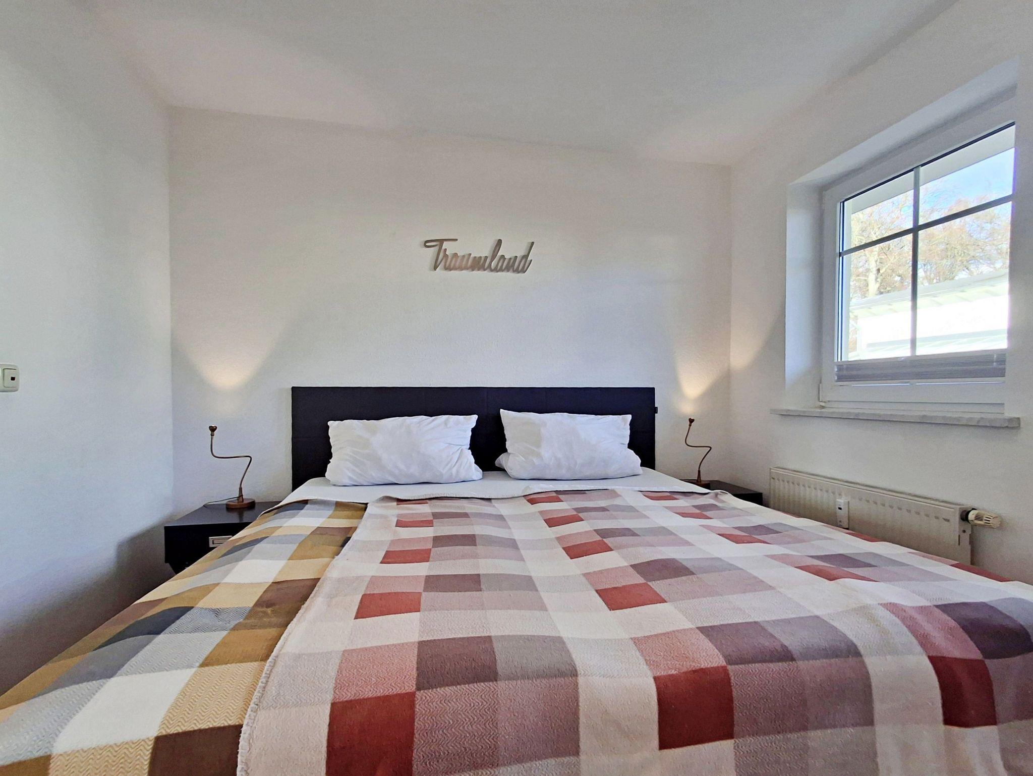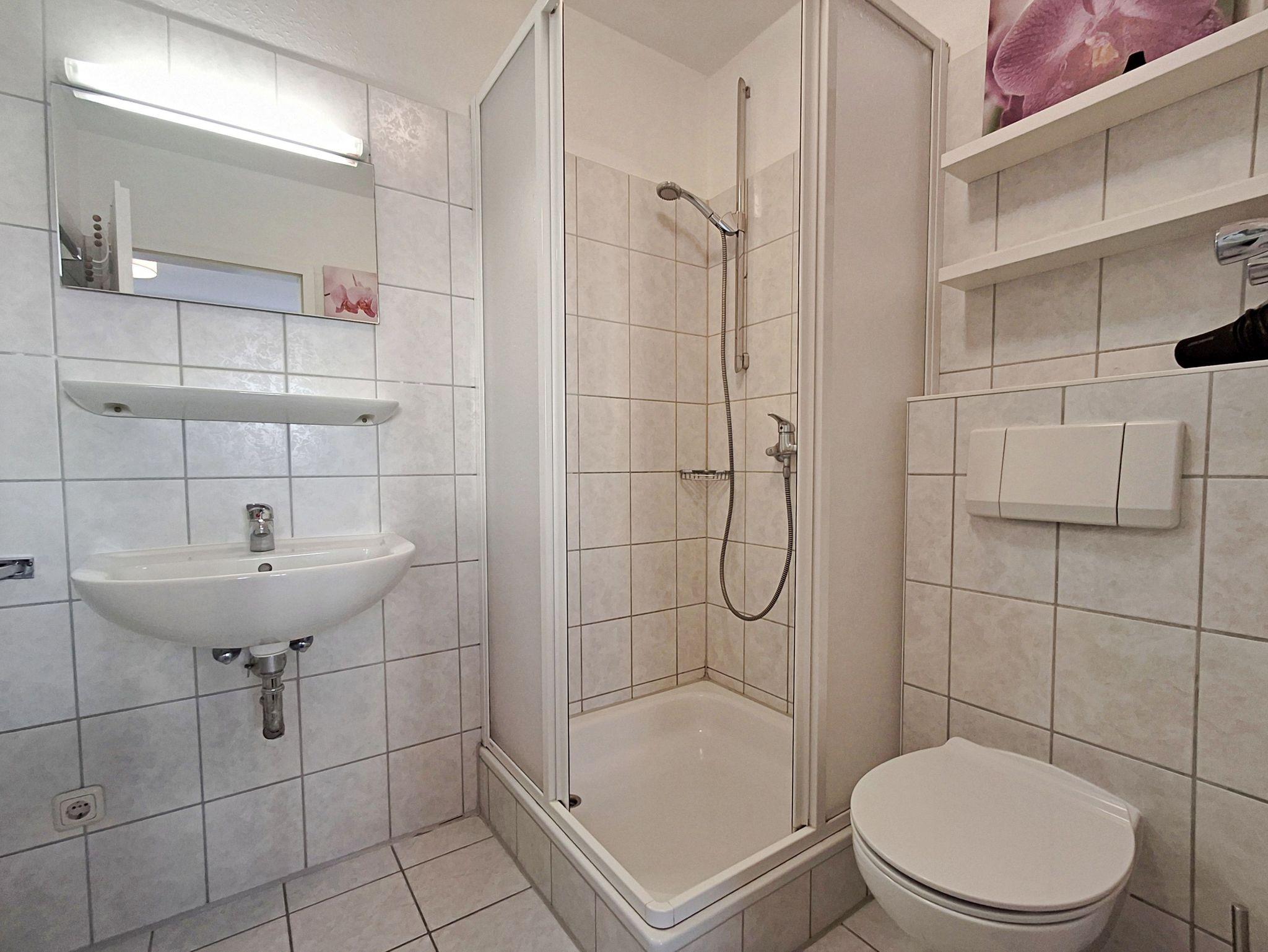 Hell, modern und freundlich - diese charmante 46 qm große Ferienwohnung im Erdgeschoss ist ein schönes Zuhause auf Zeit für bis zu 4 Personen. Der Wohnbereich und das Schlafzimmer sind mit Laminatfußboden versehen. Im offenen Wohnbereich finden Sie alles, was das Urlaubsleben angenehm macht - angefangen von der bequemen Couch, Lesesessel, Flachbild-TV, Esstisch mit 4 Stühlen bis hin zur offenen Küchenzeile mit Ceranherd, Kühlschrank, Mikrowelle, Wasserkocher, Toaster und Kaffeemaschine. Hier finden Sie alles, was nötig ist für entspannte Frühstücke oder um einen erlebnisreichen Urlaubstag ausklingen zu lassen. Das Schlafzimmer ist mit einem gemütlichen Doppelbett ausgestattet, das für erholsame Nächte sorgt. Das Badezimmer bietet Ihnen eine Dusche, WC und ausreichend Ablagefläche, um Ihren Aufenthalt so angenehm wie möglich zu gestalten. Die möblierte Terrasse (2025 saniert) ist vom Wohnzimmer aus begehbar und lädt dazu ein bei schönem Wetter bereits morgens mit einer Tasse Kaffee in den Tag zu starten. Natürlich ist kostenfreies WLAN inklusive. Ihren Pkw können Sie in der Tiefgarage parken und Ihre eigenen Räder ganz praktisch im Fahrradkeller unterstellen. Im Keller befinden sich zudem Waschmaschinen und Trockner, die gegen eine Gebühr nutzbar sind.
