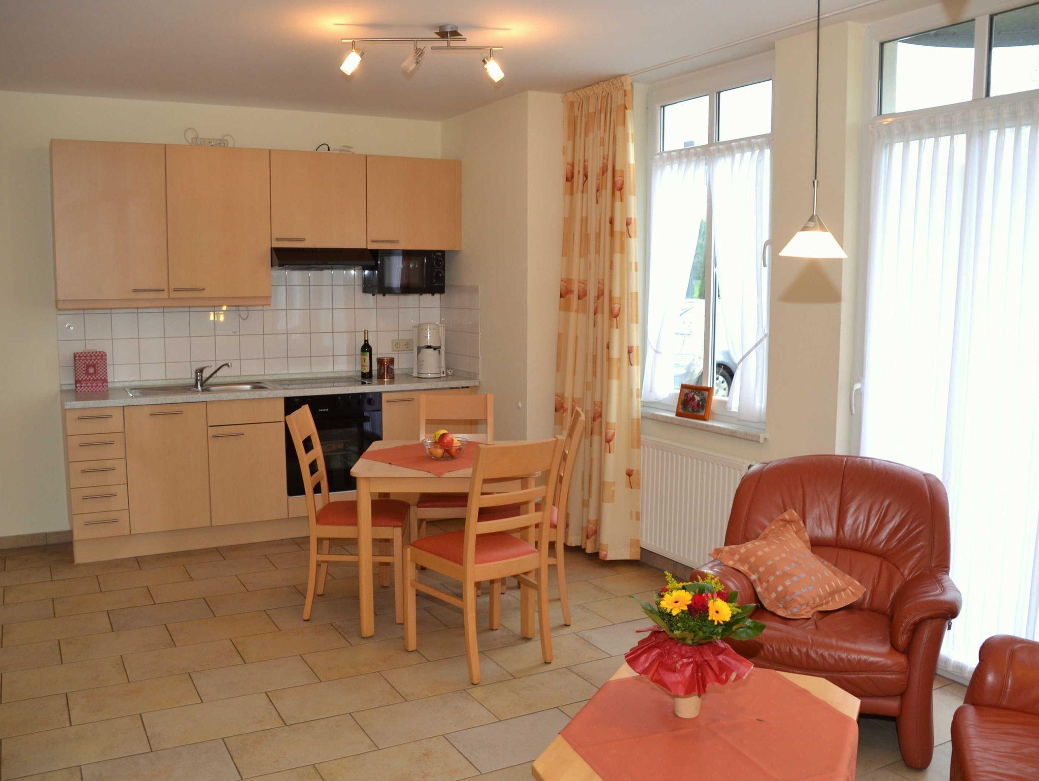 Diese stilvoll eingerichtete Wohnung mit 40² liegt im Erdgeschoss. Es gibt einen Wohnraum mit kompletter, gut ausgestatteter Küchenzeile, ein separates Schlafzimmer mit 1,80 m breitem Doppelbett, ein Bad mit Dusche (Wo. 1) oder Badewanne mit Duschvorrichtung (Wo. 4) sowie eine möblierte Terrasse. Glatte Fußböden, Ledercouch und abwischbare Bezüge kommen Allergikern entgegen. Die Nichtraucherwohnung wirkt durch viele, auch bodentiefe Fenster hell und freundlich.