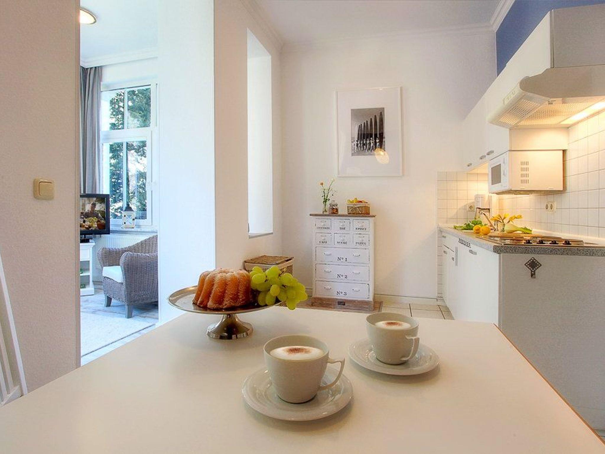 Die kleine aber feine Ferienwohnung ist das ideale Urlaubsdomizil für verliebte Pärchen, aber auch für reisefreudige Singles. Der kombinierte Wohn-, Koch- und Essbereich ist in hellen Farben mit leichten Farbnuancen gehalten und garantiert Gemütlichkeit zu jeder Jahreszeit. Die exklusive Küchenzeile ist mit Allem bestückt, was Sie für die Zubereitung Ihrer Lieblingsspeisen benötigen. Neben zwei Ceranfeldern und einem Kühlschrank findet sich auch eine Mikrowelle, Wasserkocher, Kaffeemaschine und ein Toaster. An dem separaten Esstisch können Sie die kulinarischen Speisen im passenden Ambiente genießen. In dem angrenzenden Wintergarten, mit traumhaften Blick in den gegenüberliegenden Park, bieten das hochwertige Doppelbett (160 x 200cm) und der neue 32 LCD / LED TV jeglichen Komfort um entspannt und erholt in den nächsten Urlaubstag starten zu können oder diesen ausklingen zu lassen.
