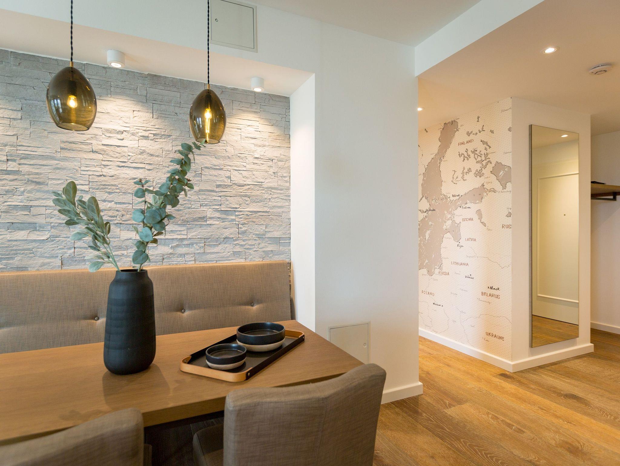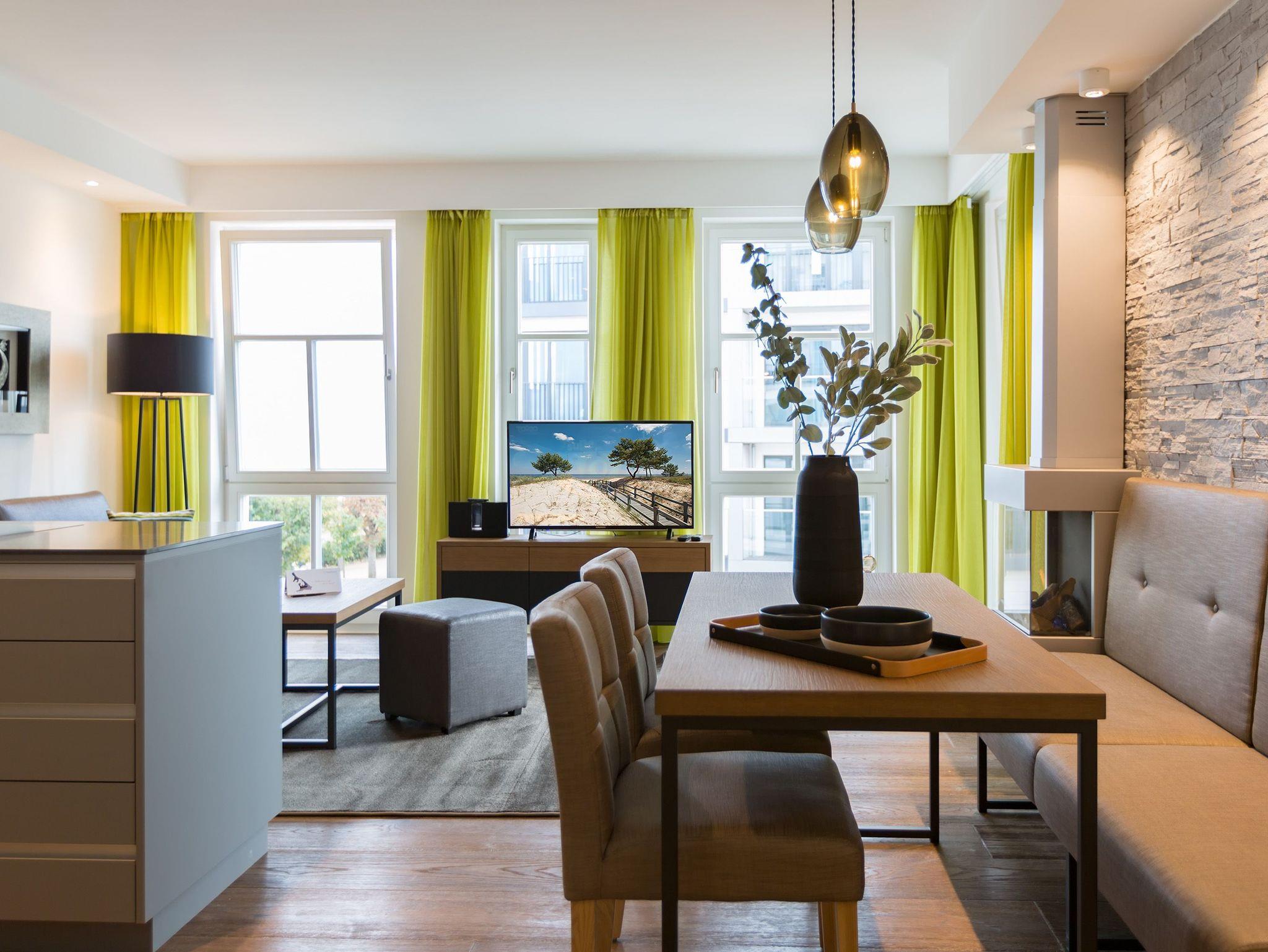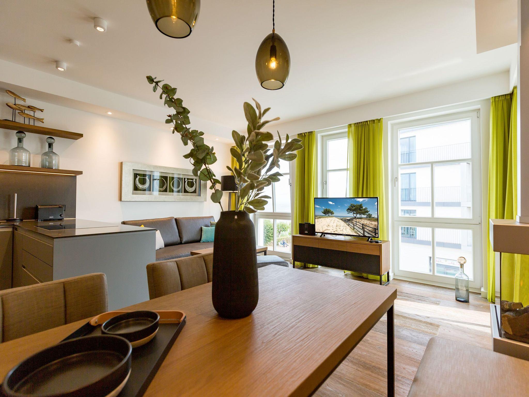 Entspannung ist ein Ort ? In diesem großzügigen und wunderschönen Drei-Zimmer-Appartement im 2. Obergeschoss erwartet Sie und Ihre Familie oder Freunde eine wunderbar entspannende Ostsee-Auszeit in exklusivem Rahmen. Genießen Sie Ihre Zeit mit bis zu vier Personen. Ein Kleinkind (bis drei Jahre im Kinderreisebett) hat auch noch Platz in den 66 Quadratmetern dieses Urlaubsparadieses. Ein helles und elegantes Wohn-Esszimmer wird zum Mittelpunkt. Frische Farben und Naturmaterialien verleihen Ihrem Domizil eine wohnliche Wohlfühlatmosphäre. Die gemütliche Sofa-Sitzgruppe vor dem Gas-Kamin mit Blick auf den großen Flat-TV ist ideal zum Entspannen und eignet sich bestens zum Zusammensitzen. Genauso wie der schöne große Esstisch, an dem alle Platz haben für gemeinsame Essen oder Plauderstunden. Das Essen zubereiten, können Sie in der zum Wohnzimmer hin offenen und voll ausgestatteten Küche. Hochwertige Markengeräte und edles Geschirr machen das Kochen oder Zubereiten feiner Speisen zu einem vergnüglichen Genuss. Ob Herd, Backofen, Kühlschrank oder Kaffeemaschine ? hier fehlt es an nichts. Vom Wohnzimmer aus, aber auch von beiden Schlafzimmern aus, haben Sie einen Zugang zum Süd-Ost-Balkon (9 Quadratmeter). Bei schönem Wetter können Sie von hier aus die Aussicht auf die Ostsee genießen. Die beiden Schlafzimmer verströmen viel Gemütlichkeit. Jeweils ein bequemes Boxspringdoppelbett (1,60 m x 2,00 m), ein großer Schrank und ein Flat-TV gehören zur Ausstattung. Zu einem echten Wellness-Paradies wird die Wohnung durch die eigene Finnische Sauna im Masterbad. Kommen Sie ordentlich ins Schwitzen, wenn Sie Ihnen einheizt. Die beiden Bäder verfügen ansonsten jeweils über eine Regendusche, einen Waschtisch und ein WC. Für eine rundum schöne Auszeit liegen Handtücher für Sie bereit und die Betten sind auch schon bezogen. In einem kleinen Hauswirtschaftsraum steht ein Wasch-Trockner zu Ihrer Verfügung. Das WLAN ist kostenfrei. In der modernen Tiefgarage ist für Sie der Stellplatz Nr. 12 im Doppelparker unten (max. Höhe 1,85 m, max. Länge 5,10 m, max. Breite 2,50 m, max. Last 2.600 kg) reserviert.