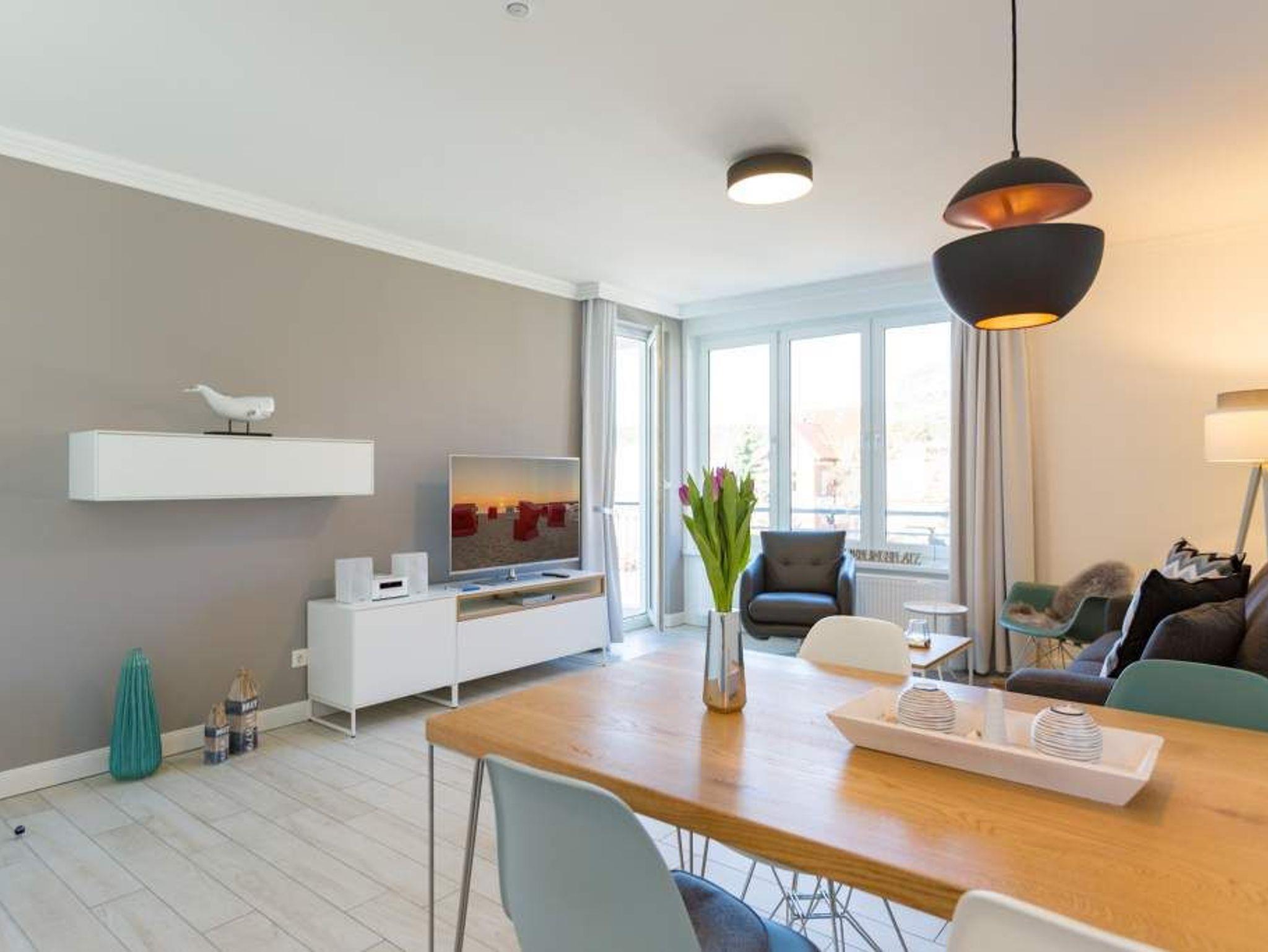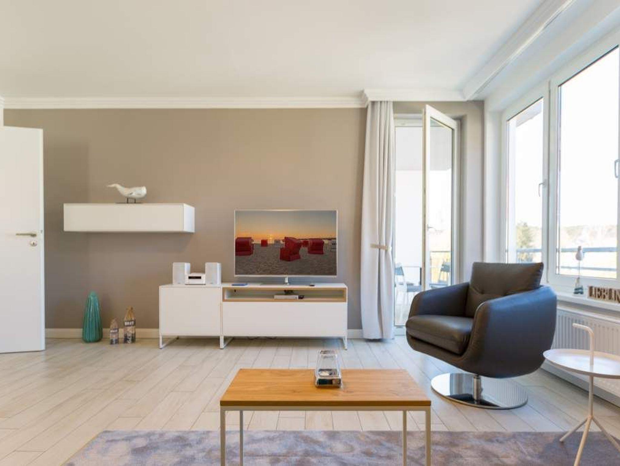 Nordisch nobel ist das Zwei-Raum-Designer-Appartement das ideale Urlaubsdomizil für bis zu 3 Personen (ab 5 Jahre, keine Kleinkinder) ? eine 56 Quadratmeter große Wohlfühlzone, die Ostseeträumen viel Platz gibt. Ein Fahrstuhl bringt Sie bequem ins 2. Obergeschoss. Haben Sie heute schon übers Wasser geschaut? Das sollten Sie in dieser Ferienwohnung unbedingt tun. Denn von hier aus haben Sie sogar zweifachen Seeblick. Vom West-Balkon aus können Sie auf den glitzernden Schloonsee und seitlich auf die Ostsee hinaus schauen. Das großzügige und lichtdurchflutete Wohnzimmer besticht durch die Eleganz seiner ausgewählten Design-Möbel exklusiver Hersteller wie Hay, Hülsta oder Vitra. Das bequeme Sofa aus der italienischen Möbelproduktion Dienne Salotti kann zu einer Schlafcouch umfunktioniert werden. Mit einer Liegefläche von 1, 62 m x 1,97 m eignet sie sich bestens als Aufbettung für die 3. Person. Machen Sie es sich gemütlich im Lederdrehsessel oder im stylischen Schaukelstuhl und genießen die Heimkino-Atmosphäre vor dem großen Flat-TV mit Blue Ray und DVD-Player. Bei Schietwetter ? was auf Usedom allerdings äußerst selten vorkommt ? können Sie auf eine Auswahl an Video-Filmen zurückgreifen. Oder lassen Sie sich durch die angebotenen Bücher in die Welt des Lesens entführen. Ihre Lieblingsmusik können Sie über die HiFi-Anlage mit Bluetooth hören. Das Wohnzimmer öffnet sich hin zu einem wunderschönen Essplatz mit Holztisch und vier Vitra Design-Stühlen. Ein ausgeklügeltes Lichtkonzept sorgt für genügend Helligkeit und eine heimelige Atmosphäre. In der zum Wohn-Esszimmer hin offenen Küche finden Sie alles, was Sie für die Zubereitung feiner Speisen benötigen. Hochwertige Markengeräte erleichtern die Arbeit. Neben der Kaffeemaschine gibt es zusätzlich eine Nespresso-Maschine. Auch den Träumen ist in diesem Appartement viel Raum gegeben. Das Schlafzimmer wartet mit einem komfortablen Boxspringdoppelbett (1,80 m x 2,00 m), einem weiteren Flat-TV sowie einem geräumigen Kleiderschrank auf. Das Badezimmer ist mit Dusche, großem Waschbecken und WC ausgestattet. Für Ihr Auto ist ein Stellplatz Nr. 43 (nur PKW - keine Kombis) im Doppelparker oben (max. PKW-Höhe 1,50 m, PKW Länge max. 5,00 m, Gewicht max. 2t ) reserviert. Für jeglichen Urlaubskomfort ist das WLAN kostenfrei. Bettwäsche und Handtücher sind ebenfalls inklusive.