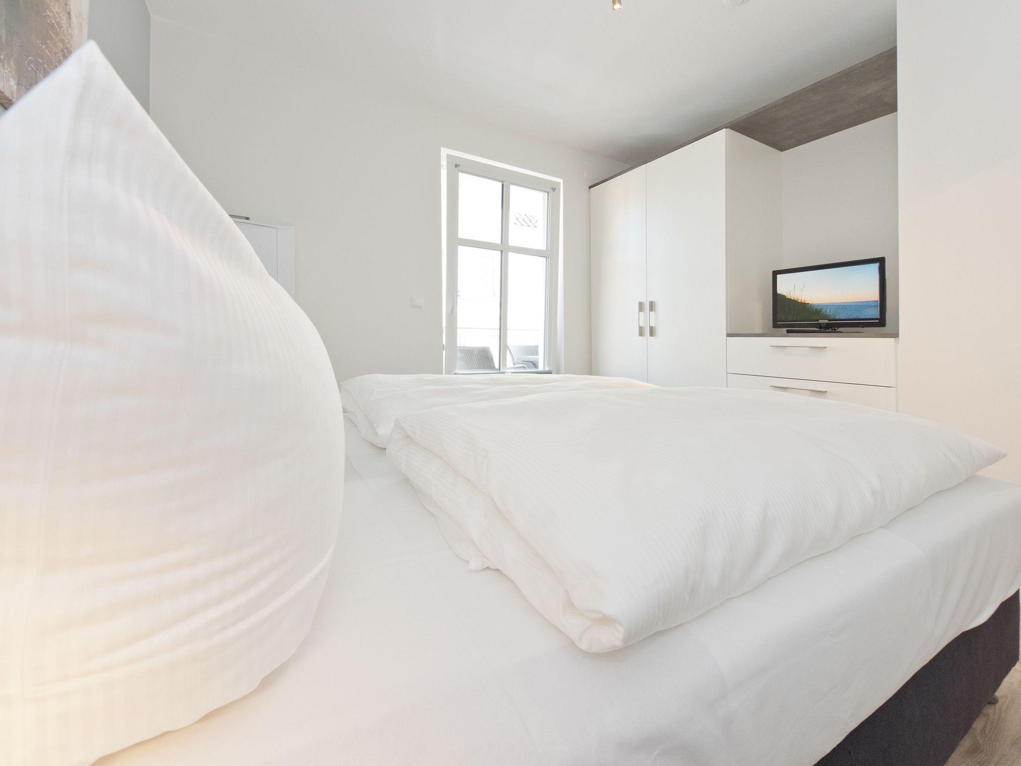 Clean und dennoch gemütlich empfängt Sie dieses 3-Zimmer-Appartement auf 58qm im 1. Obergeschoss für bis zu 4 Personen. Ein offener Wohn-Ess-Bereich mit bequemer Sofalandschaft und zwei zusätzlichen Sesseln sowie einem Flat-TV laden zum gemütlichen Beisammensein ein. Das Highlight des Wohnraumes bildet der Gaskamin, der sich bequem per Fernbedienung steuern lässt. Seine wohlige Wärme versprüht er bis zum Essplatz gegenüber, der Platz für bis zu 4 Personen bietet. In der voll ausgestatteten Küche (Ceranfeld, Backofen, Spülmaschine, Mikrowelle, Kühlschrank mit Gefrierfach und Kleinküchengeräte) bleiben keine Wünsche offen beim Zubereiten Ihrer Speisen. Genießen Sie Ihren ersten Kaffee am Morgen oder ein schönes Glas Wein am Abend auf dem am Wohnraum angeschlossenen Südost-Balkon, der mit Sitzmöbeln ausgestattet ist. Einen weiteren Balkon (Südwest) finden Sie an einem der zwei Schlafzimmer. Für erholsamen Schlaf im Urlaub sorgen die Boxspringbetten (1,80m x 2,00m und 1,80m x 1,90m). Flat-TV in den Schlafräumen runden diese ab. Zwei Bäder mit Dusche, Waschtisch und WC bieten den Komfort, den Sie als befreundetes Pärchen im Urlaub benötigen. Kostenfreies WLAN und ein Pkw-Stellplatz am Haus runden dieses Urlaubsdomizil ab.