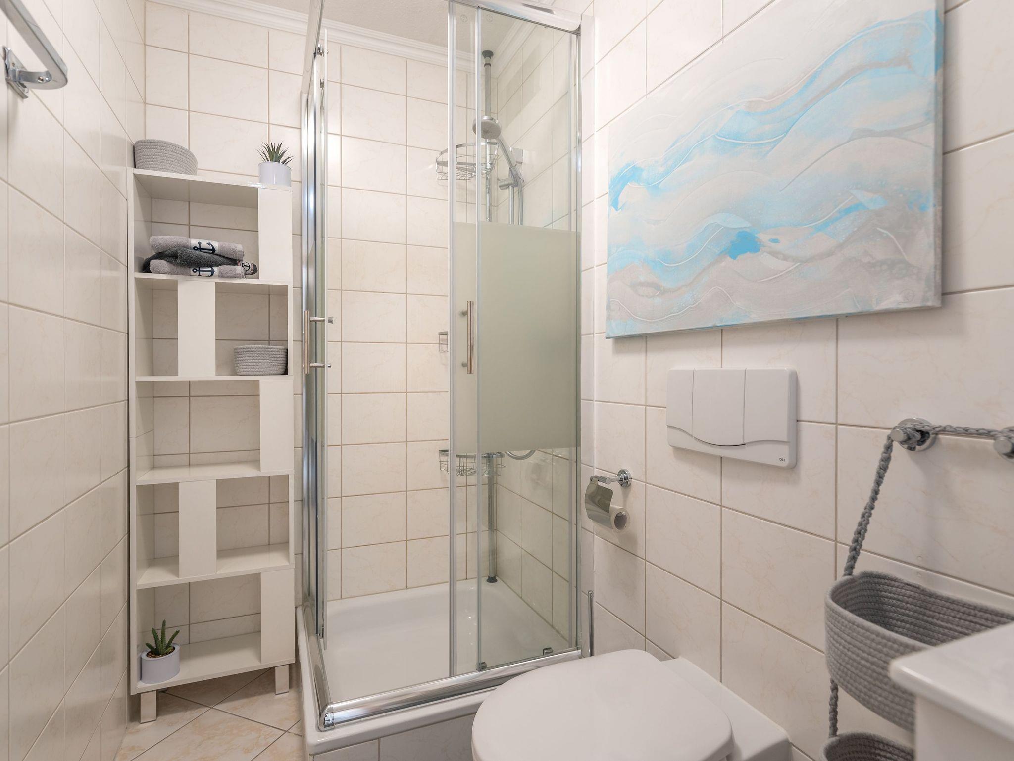 • Badezimmer: Modernes Badezimmer mit Ganzglasdusche und WC.