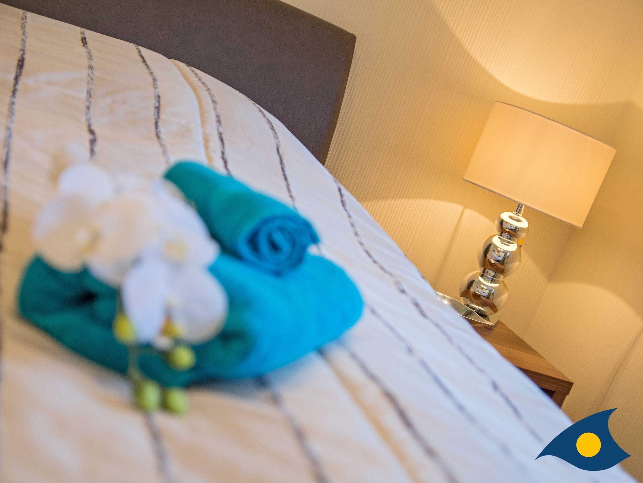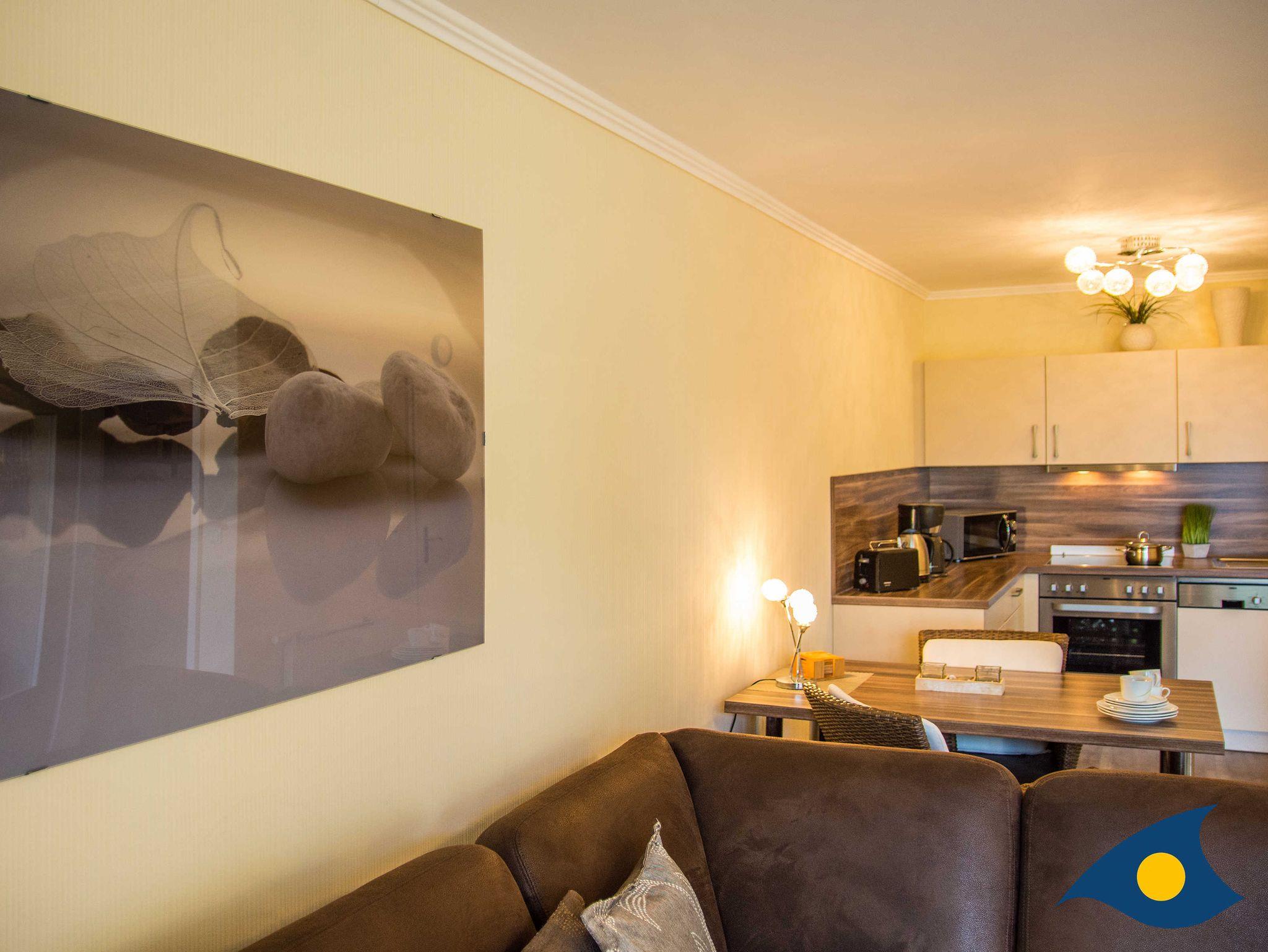 Modern, liebevoll und gemütlich ausgestattet begrüßt Sie diese herrliche 2-Raum-Ferienwohnung. Das Wohnzimmer mit dem bequemen Sofa, der großen Fensterfront und der offenen Küche lässt Sie einen traumhaften Urlaub zu Zweit erleben. Der schöne Balkon lädt zum Frühstücken, zum Stöbern in einem schönen Buch oder einem Gläschen Wein ein. Von hier aus reicht der Blick bis zum Meer und zum weißen Sandstrand. Diesen erreichen Sie in 3 Minuten zu Fuß.
