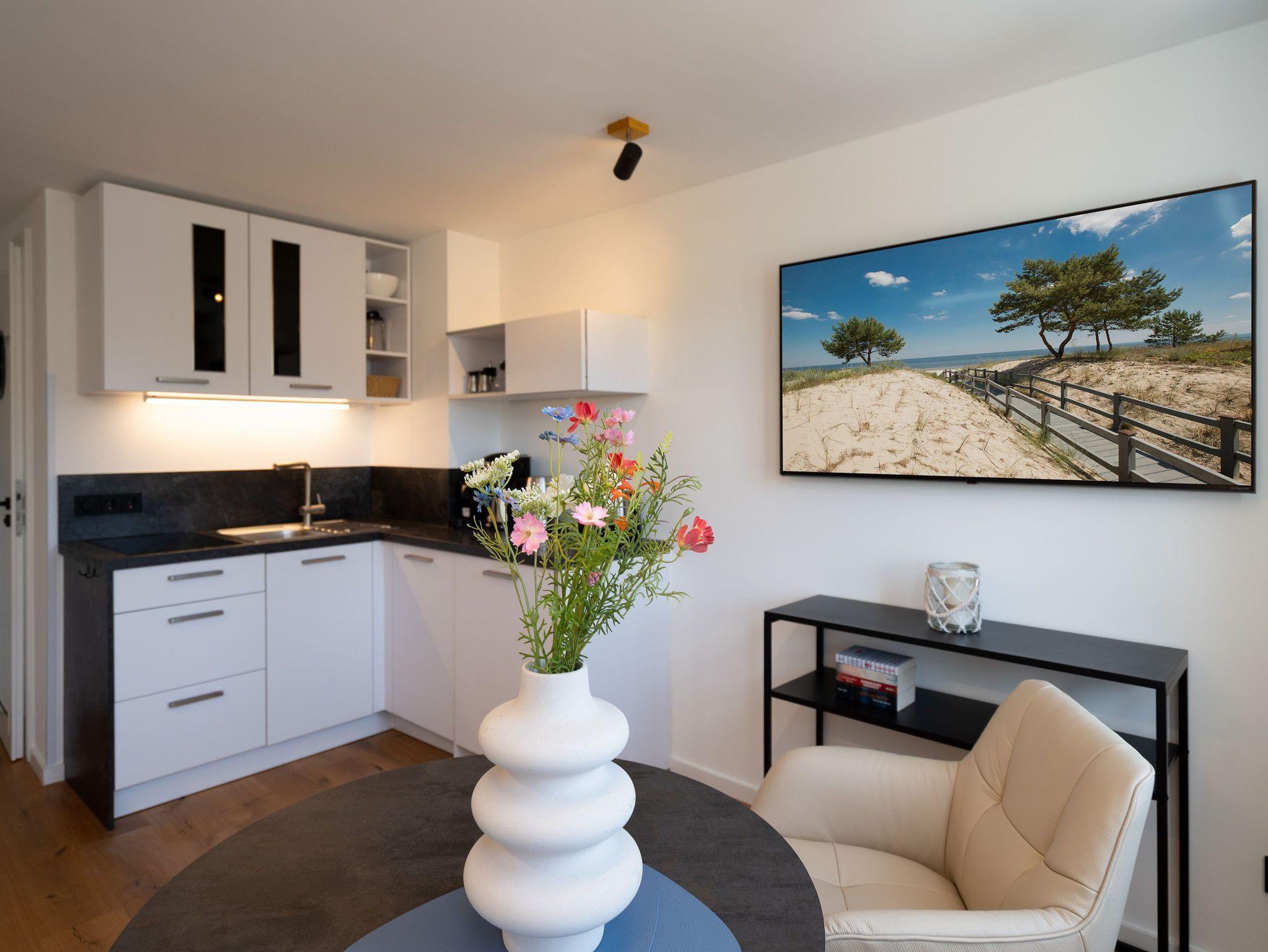 2-Raum-Appartement mit Elektrokamin ? Wohlfühlambiente unterm Dach. Das 2-Raum-Appartement Nr.?9 im Dachgeschoss der Villa Elisabeth bietet auf 32?m² eine stilvolle Rückzugsmöglichkeit für zwei Personen ? mit liebevollen Details, durchdachter Ausstattung und einem Hauch Gemütlichkeit, der schon beim Reinkommen spürbar wird. Im offenen, hellen Wohnbereich finden Sie eine moderne Küchenecke mit 4-Platten-Cerankochfeld, Spülmaschine, Kühlschrank mit Gefrierfach und Nespresso-Kapselmaschine ? ideal für den selbstgemachten Urlaubskaffee oder das kleine Abendessen zu zweit. Der Essplatz bietet Raum für gemeinsame Mahlzeiten, während Sofa, 55-Zoll-Flat-TV und ein stimmungsvoller Elektrokamin mit Fernbedienung für entspannte Abende sorgen ? ganz ohne Holz, Rauch oder Aufwand. Im separaten Schlafzimmer sorgt ein bequemes Boxspringbett (1,60?m x 1,95?m) für erholsamen Schlaf. Der Kleiderschrank bietet ausreichend Platz für Ihre Garderobe. Das Tageslicht-Bad ist mit einer Dusche (0,85m x 0,70m), Waschtisch und WC ausgestattet ? kompakt, hell und funktional. Ihr Fahrzeug parkt wettergeschützt unter dem Carport auf dem Hof ? Stellplatz Nr.?9 gehört exklusiv zu Ihrer Wohnung. WLAN steht selbstverständlich kostenfrei zur Verfügung. Ein gemütlicher Rückzugsort mit besonderem Charme ? perfekt für erholsame Tage an der Ostsee.