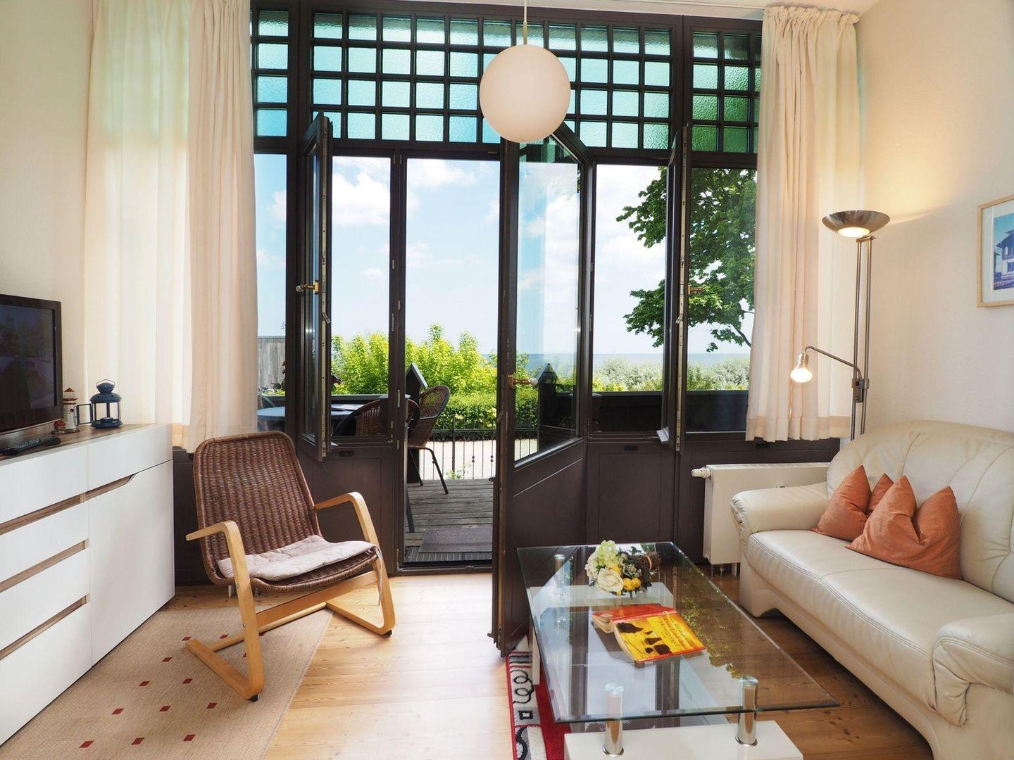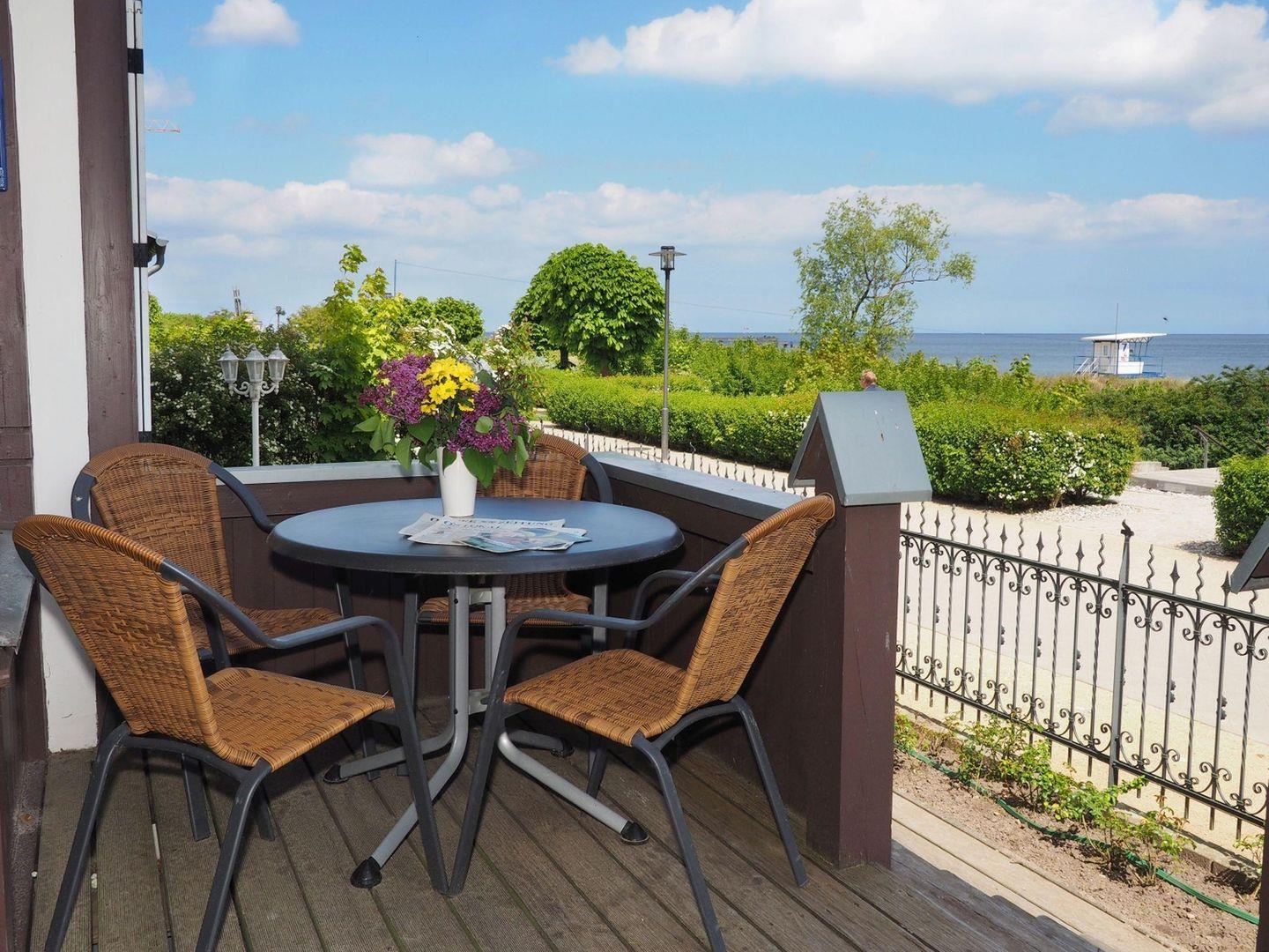 Diese sehr komfortabel und gemütlich ausgestattete Ferienwohnung bietet einen direkten Blick auf die Strandpromenade und die Ostsee. Sie finden hier eine offene Küche mit Zugang zur Loggia und zur Terrasse, ein Wohn-/Schlafzimmer und ein separates Schlafzimmer. Somit ist diese Wohnung mit bis zu vier Personen bewohnbar. Es handelt sich bei dem zweiten Doppelbett um ein hochwertiges Schrankbett, welches tagsüber hochgeklappt den Eindruck eines Schrankes vermittelt. Waschmaschine und Fahrradabstellraum sind im Haus vorhanden. Ein PKW-Stellplatz auf dem Hof gehört zur Wohnung. WLAN ist vorhanden und kostenfrei.