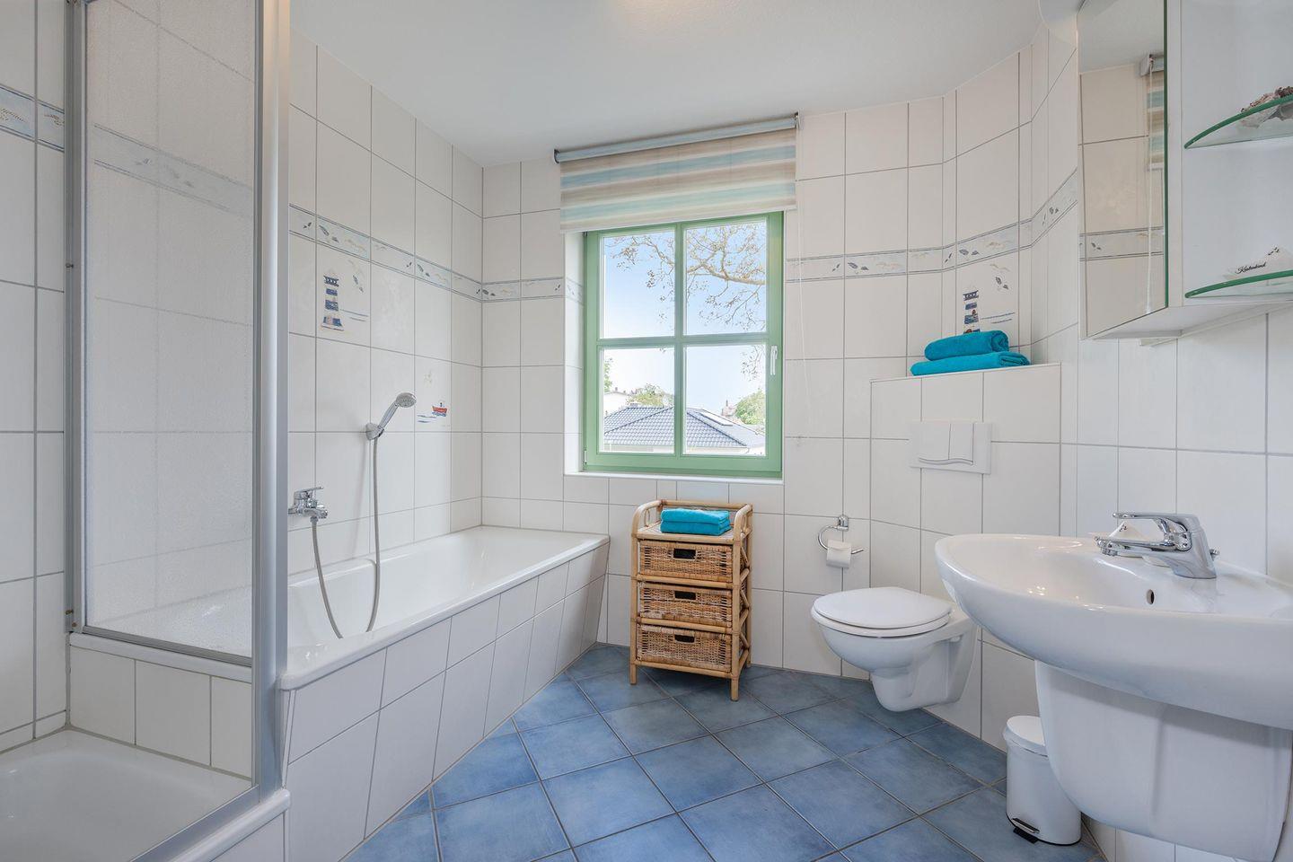 Das Badezimmer verfügt über eine komfortable Größe, wird dank des Fensters in natürlichem Licht erhellt und ist ausgestattet mit einem WC, Waschbecken und einem Haartrockner - nach Belieben können Sie sich in der Dusche erfrischen oder in der Badewanne entspannen.
