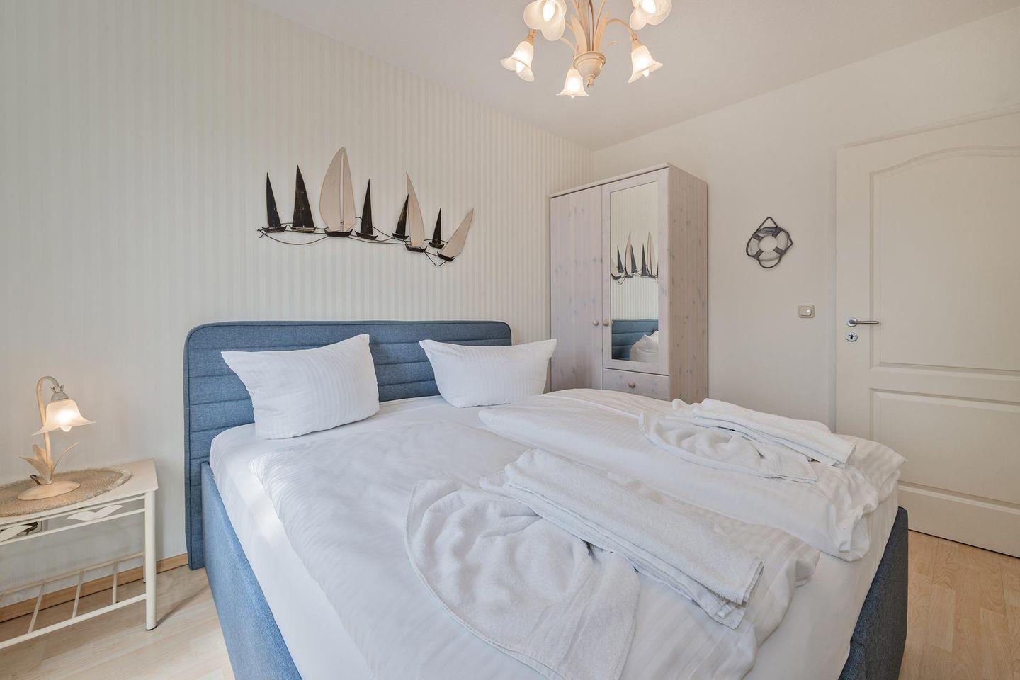 Die beiden Schlafzimmer der Wohnung laden zu geruhsamen Stunden ein. Beide Räume sind jeweils mit einem Doppelbett und einem Kleiderschrank eingerichtet. Eines der beiden Schlafzimmer bietet zusätzlich einen Fernseher.