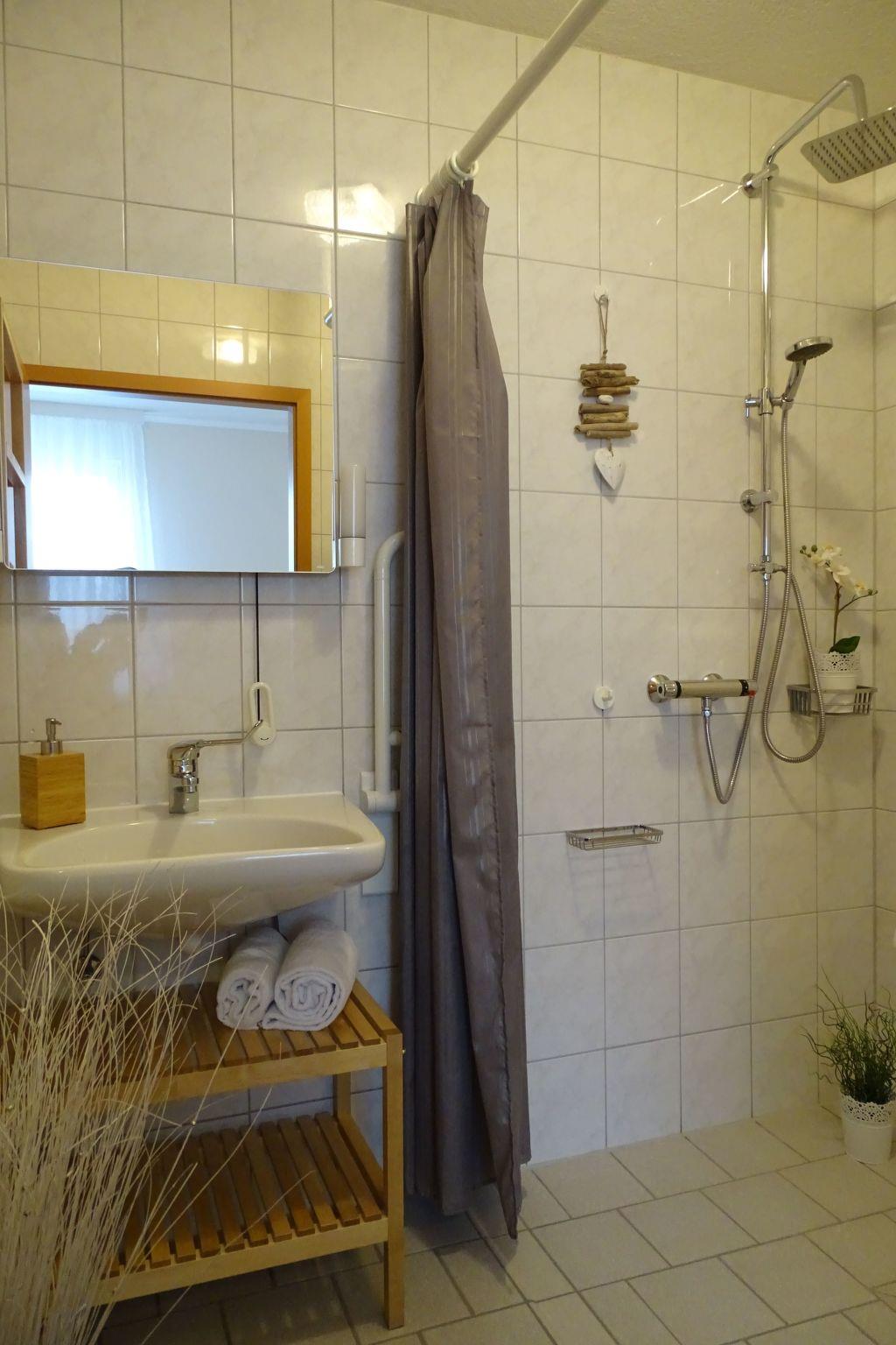 Inside, you will find a practical yet cosy interior. The centrepiece of the flat is a lovingly designed living and dining area with a sofa bed that invites you to linger. An open-plan kitchen, fully equipped with hob, oven, coffee machine, kettle, fridge and dishwasher, leaves nothing to be desired. The bedroom has a comfortable 180 cm wide double bed and a large wardrobe with a mirrored door. The barrier-free bathroom boasts a spacious, floor-level shower, which provides cosy warmth even on cooler days thanks to underfloor heating.