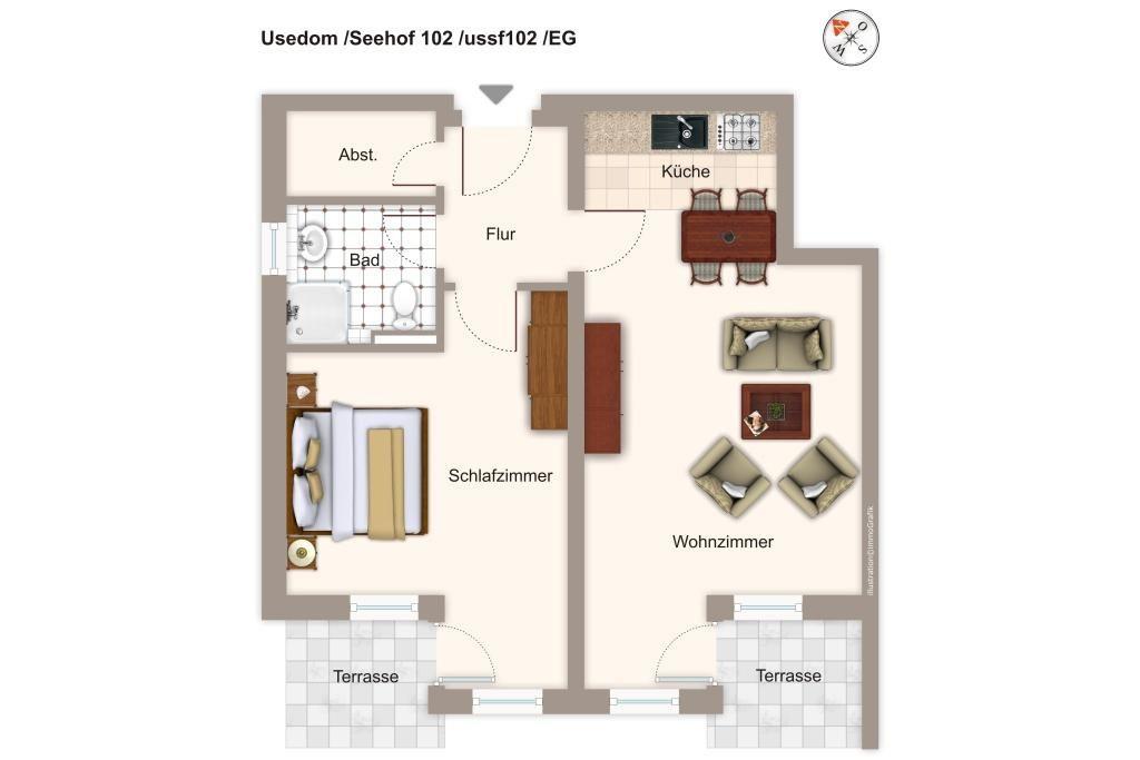 Die familienfreundliche Ferienanlage befindet sich in einer einzigartigen Lage zwischen Ostseestrand und Schloonsee. Das Apartment befindet sich im Erdgeschoss von Haus 1 in Südwestlage.