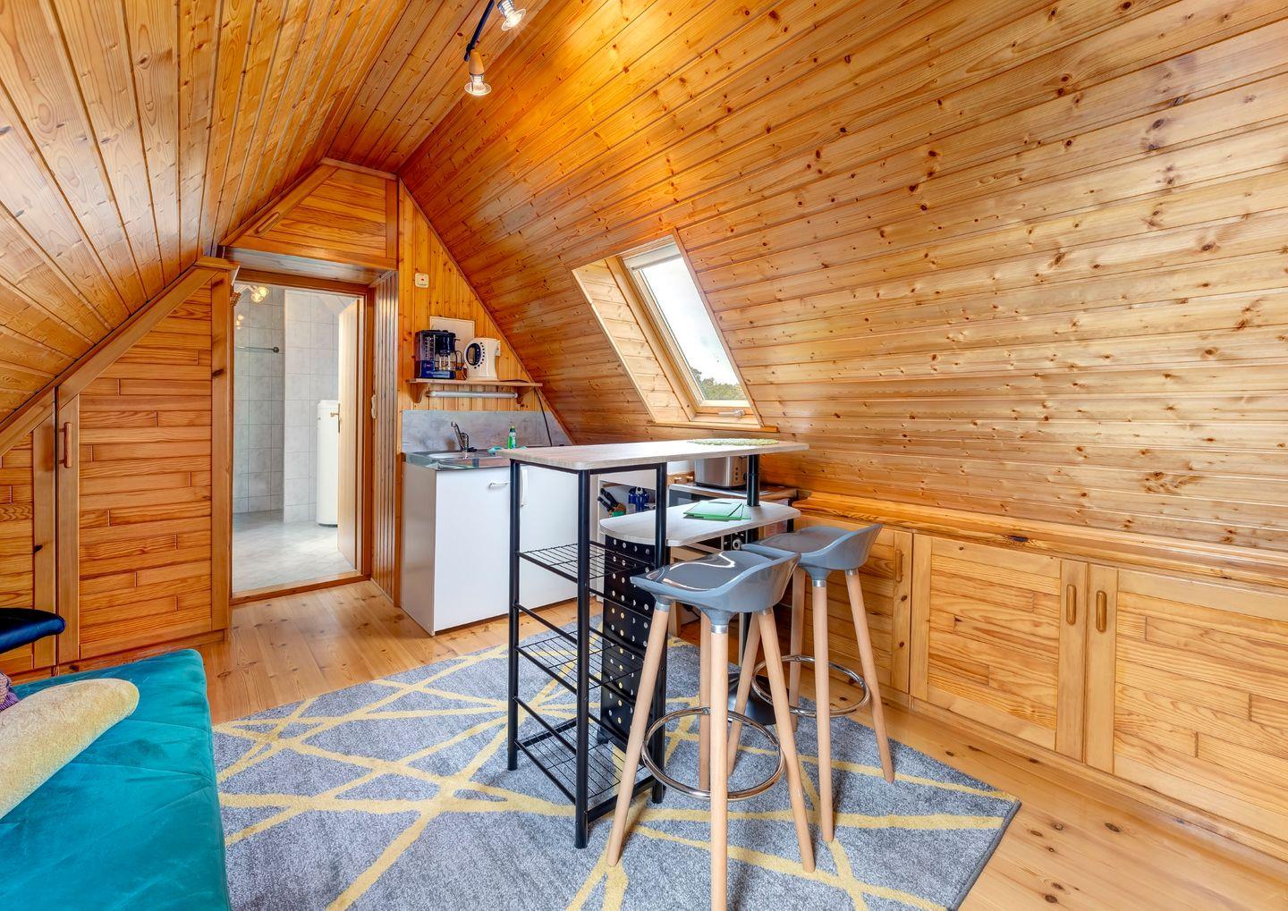 Die Dachgeschosswohnung besteht aus einem Zimmer mit einem Schlafzimmer, einer offenen Küche und einem Bad.