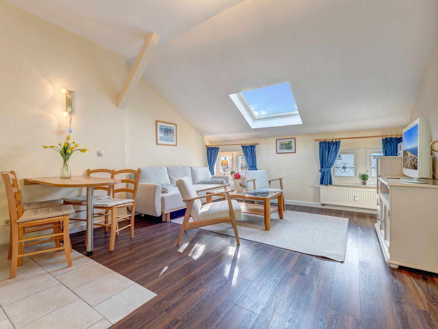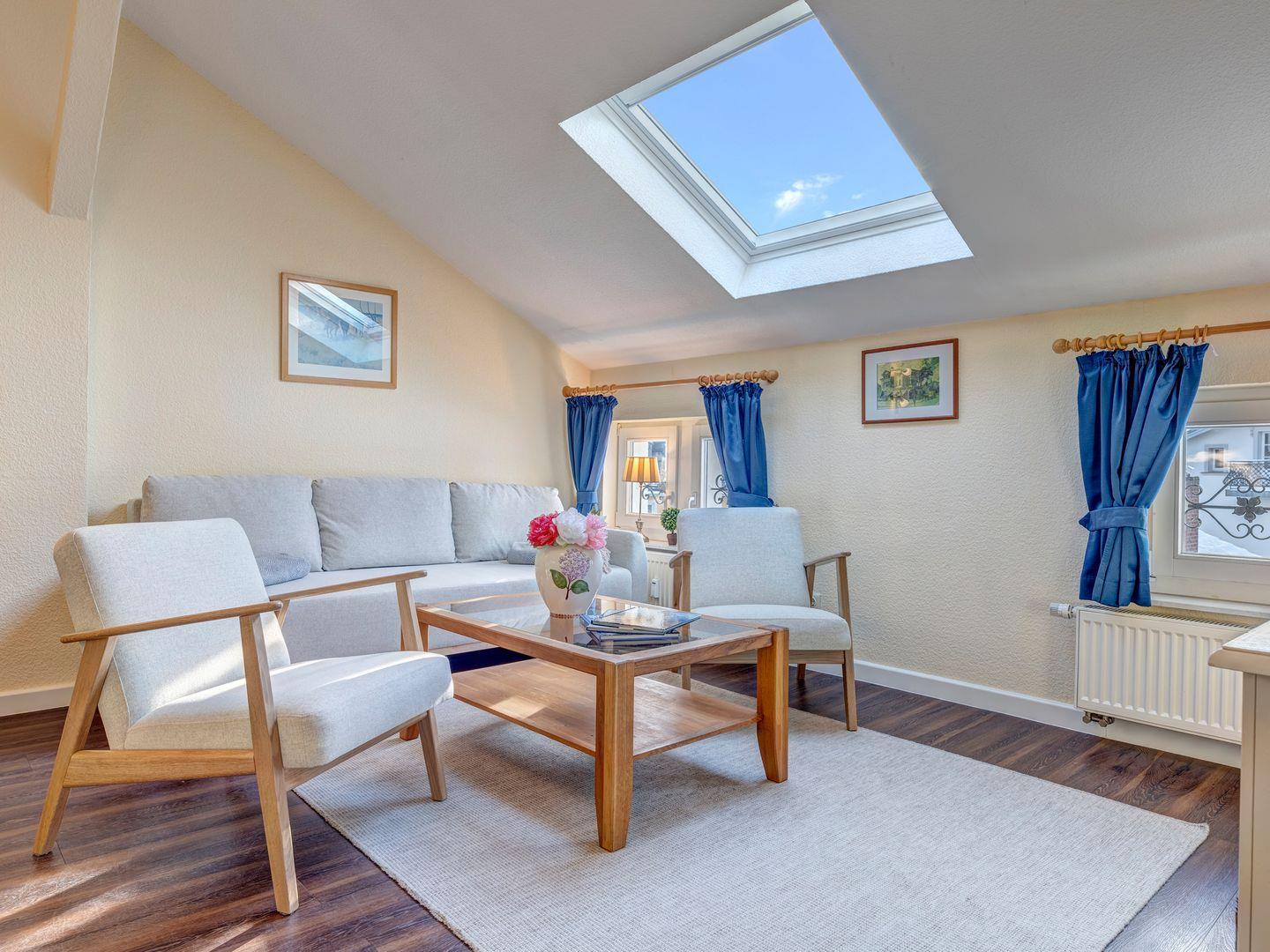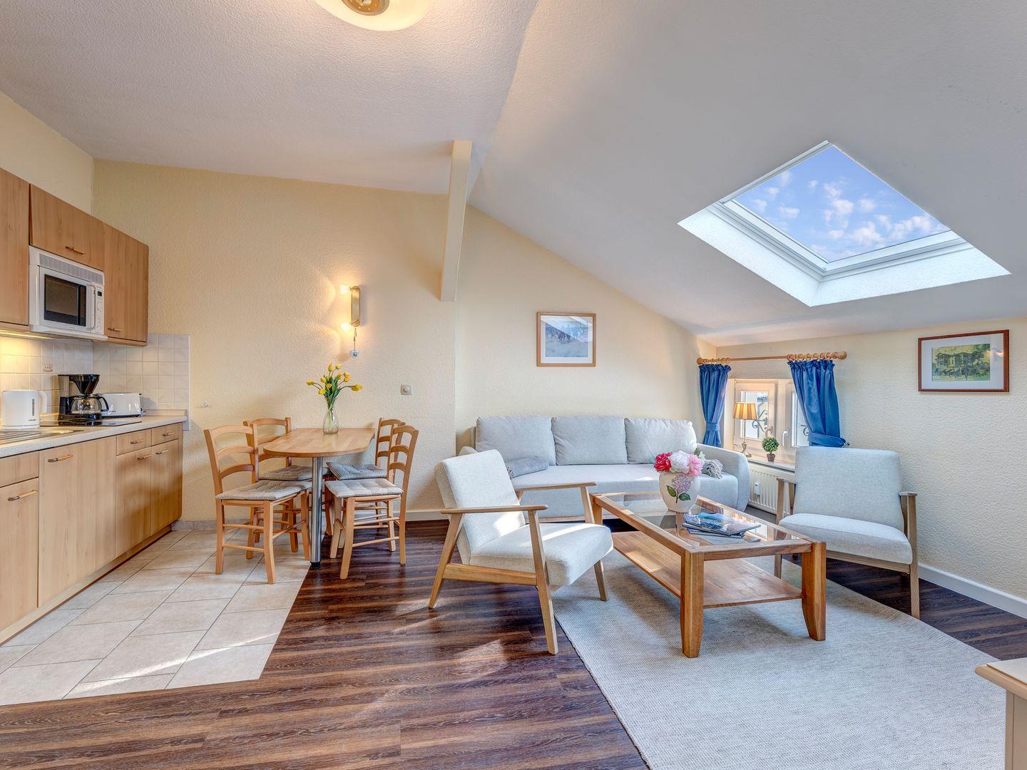 Die lichtdurchflutete Wohnung bietet zwei Zimmer mit charmanten Dachfenstern. Im behaglichen Wohnzimmer finden Sie eine komplett ausgestattete Küchenzeile mit Cerankochfeld – perfekt, um Ihre Lieblingsgerichte zuzubereiten. Das separate Schlafzimmer sorgt für erholsamen Schlaf, während das helle Tageslichtbad mit modernen Annehmlichkeiten zum Wohlfühlen einlädt.