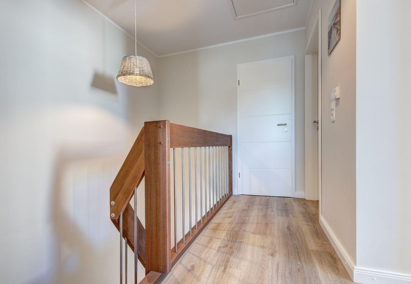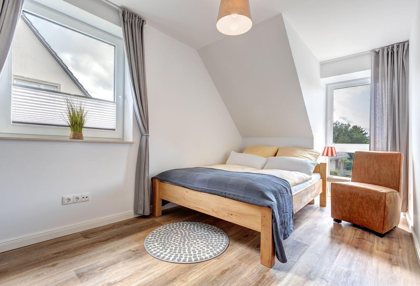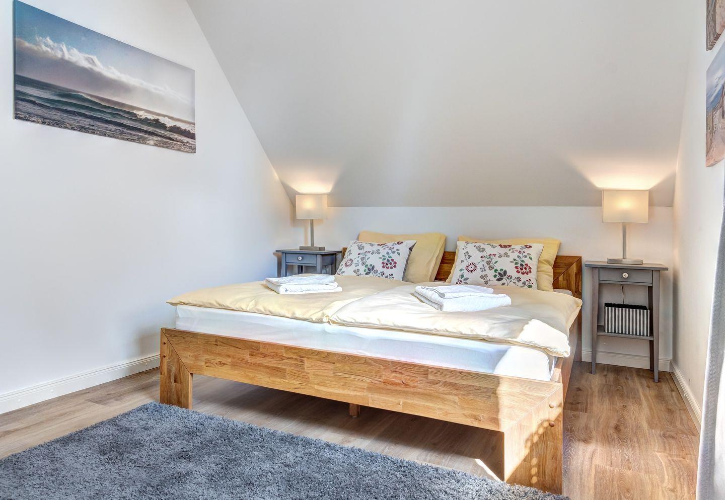 In der oberen Etage finden Sie ein weiteres Duschbad sowie drei gemütliche Schlafzimmer, jeweils ausgestattet mit einem komfortablen Doppelbett und zwei Betten von 140 cm Breite. Hier findet eine ganze Familie oder eine Reisegruppe bis zu 6 Personen Platz.