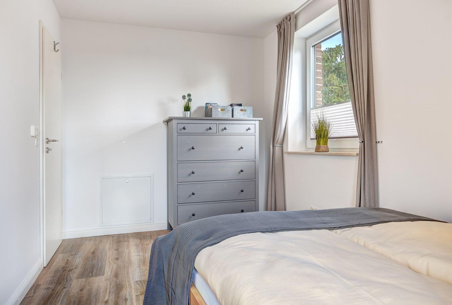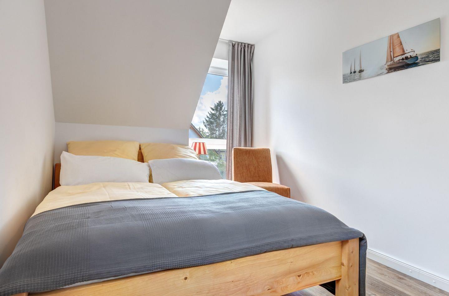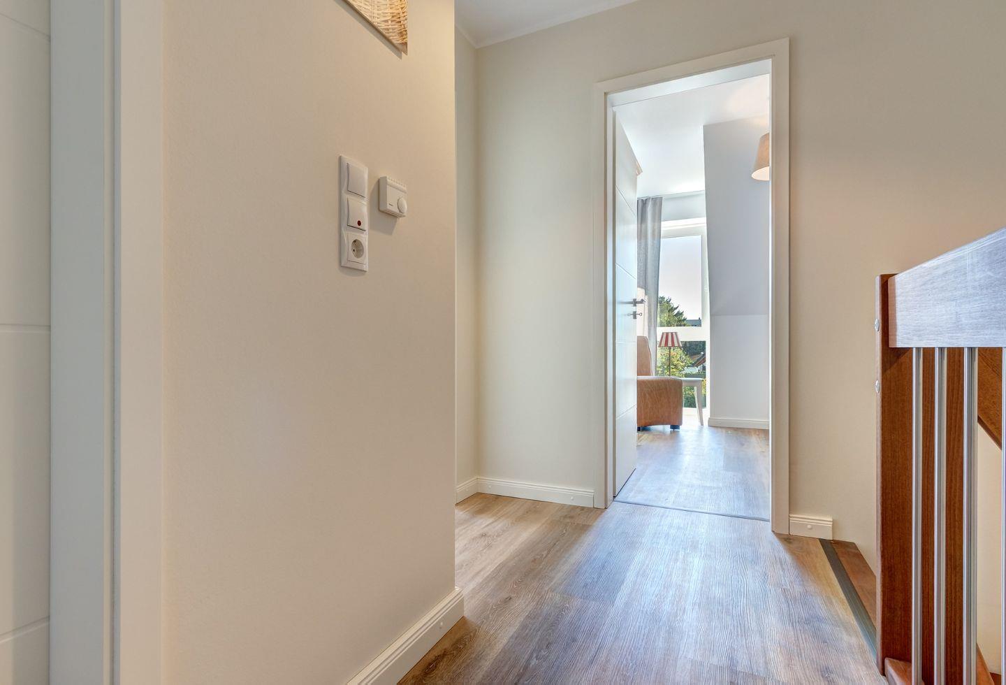 In der oberen Etage finden Sie ein weiteres Duschbad sowie drei gemütliche Schlafzimmer, jeweils ausgestattet mit einem komfortablen Doppelbett und zwei Betten von 140 cm Breite. Hier findet eine ganze Familie oder eine Reisegruppe bis zu 6 Personen Platz.