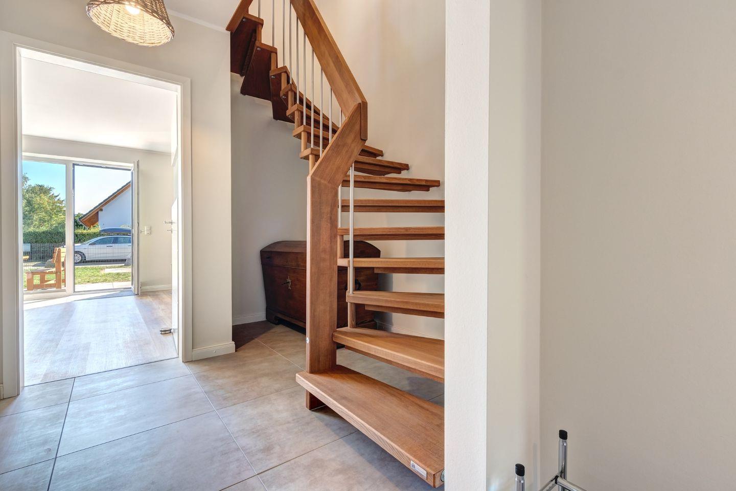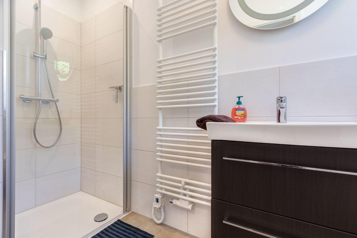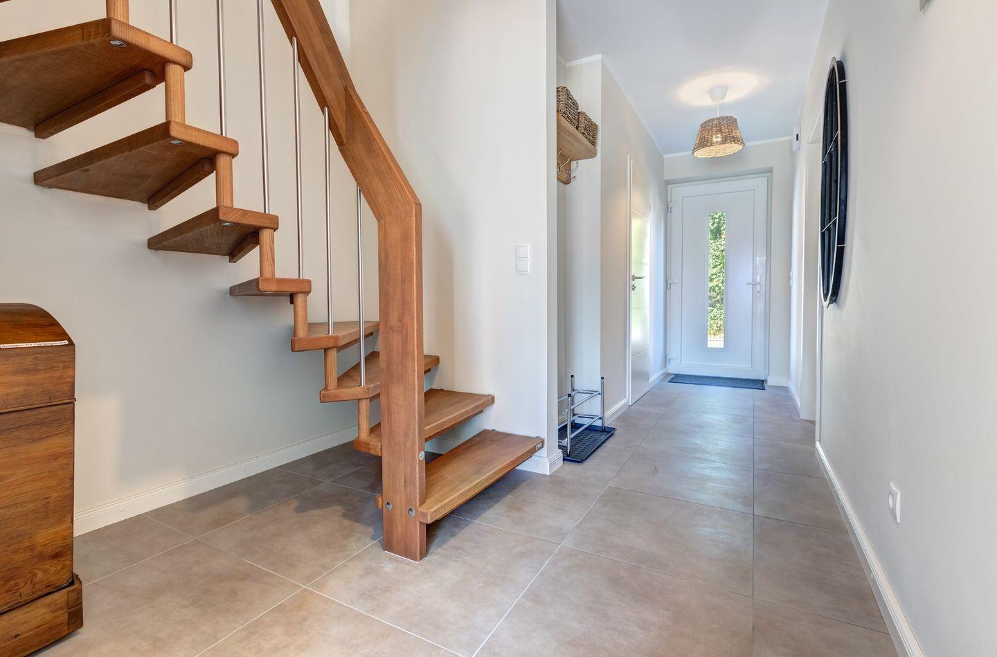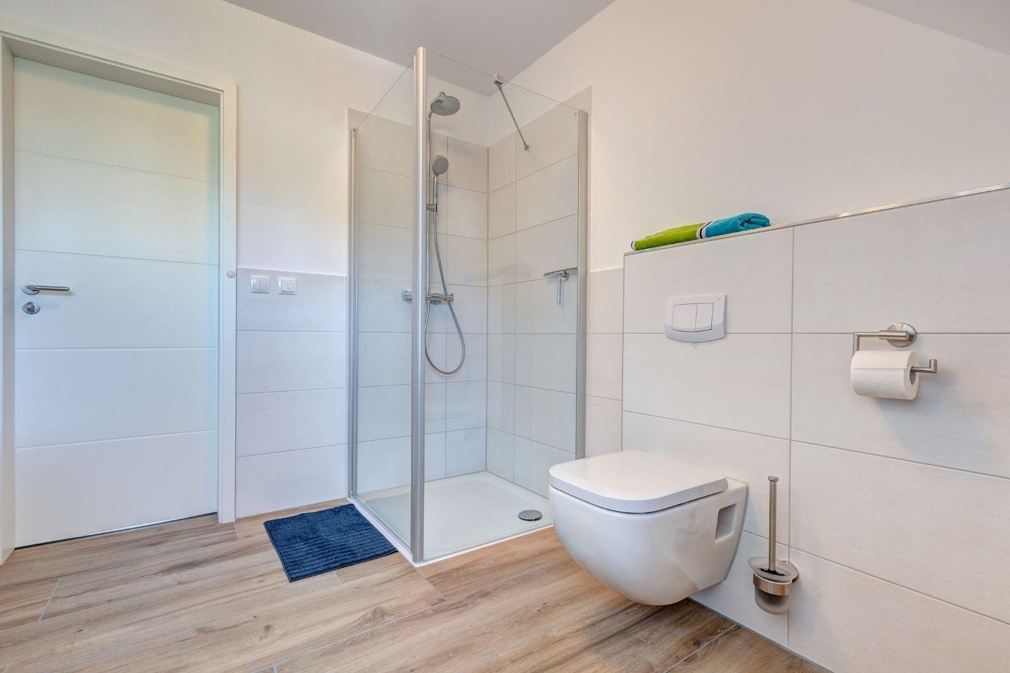 Im Erdgeschoss erwartet Sie ein offener Wohn- und Essbereich, der mit einer modernen Einbauküche inklusive Backofen, Kühlschrank und Geschirrspüler verbunden ist. Von hier aus gelangen Sie auf die sonnige und großzügige Terrasse. Ein Duschbad im Erdgeschoss sorgt für zusätzlichen Komfort.