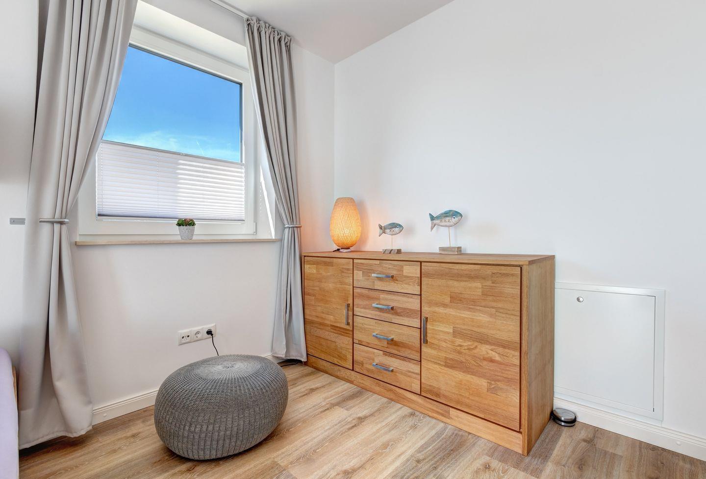 In der oberen Etage befinden sich ein weiteres Duschbad und drei Schlafzimmer. Alle Matratzen sind mit Milbenschutzbezügen versehen, um Ihnen einen ungestörten Schlaf zu ermöglichen. Für Familien mit kleinen Kindern gibt es die Möglichkeit, die Treppe mit einer Brüstungstür zu sichern.