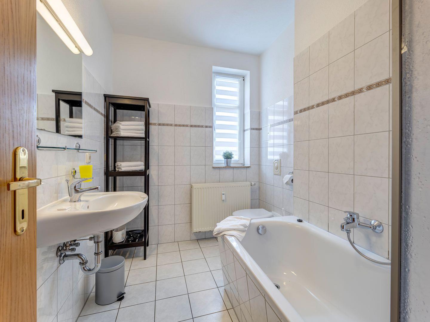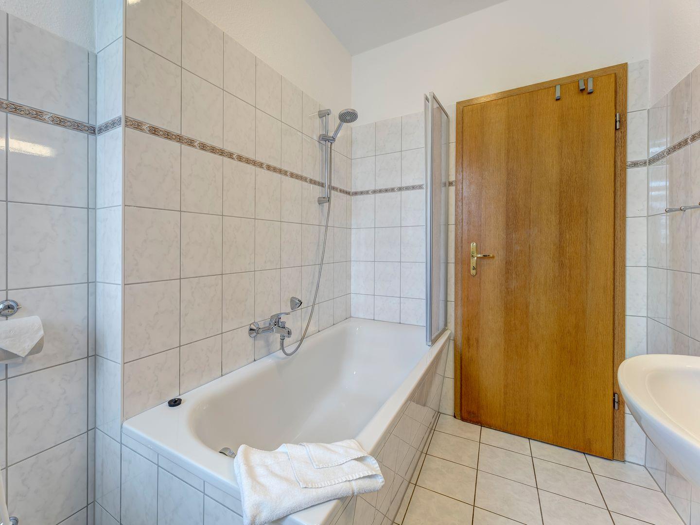 Das Bad ist mit WC, einer Badewanne ausgestattet, welche auch das Duschen ermöglich.