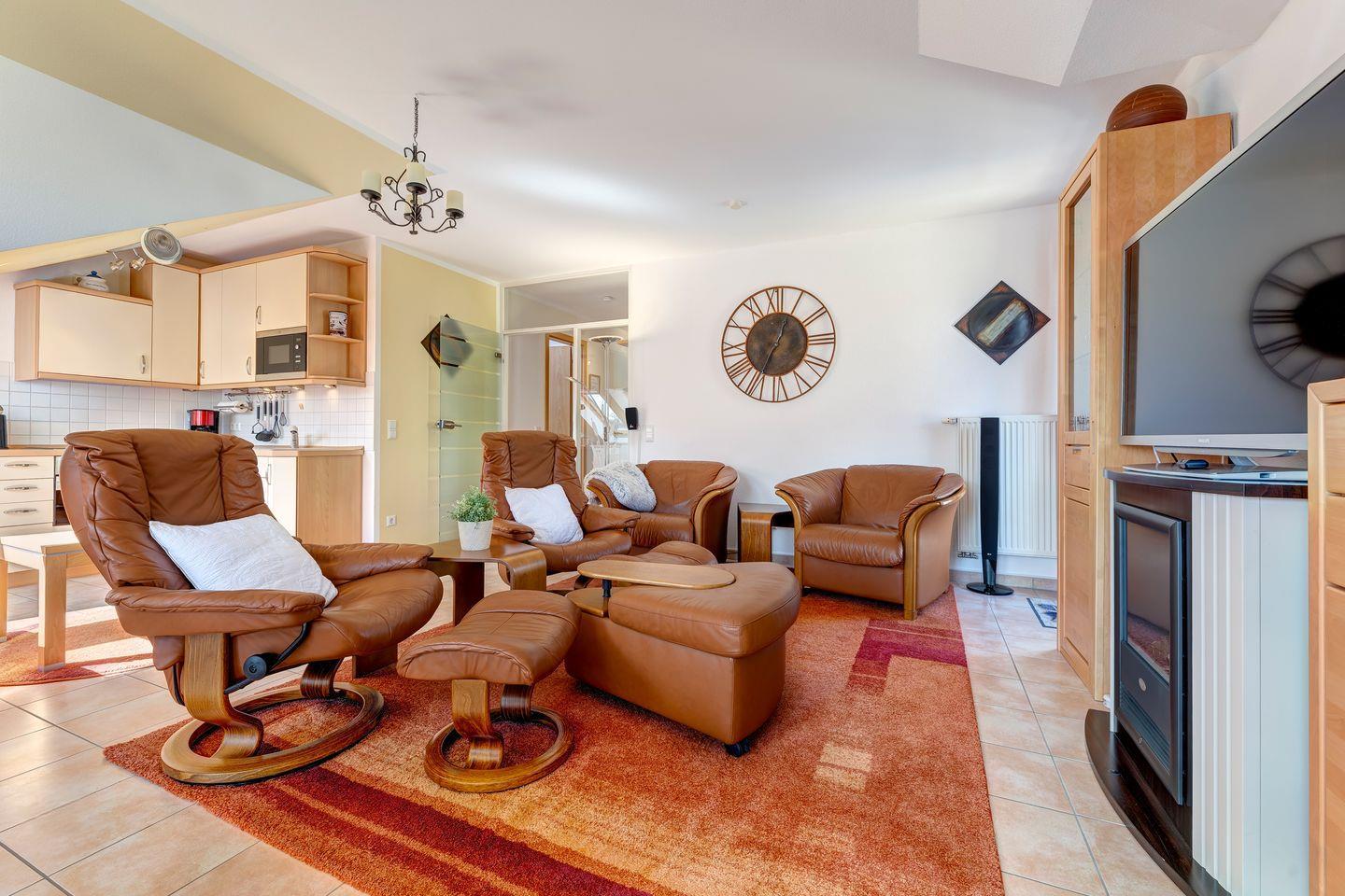 Ideal für 4 Gäste, ist die Ferienwohnung exklusiv und geschmackvoll eingerichtet. Sie verfügt über einen kombinierten Wohn- und Essbereich mit moderner Küche, zwei Schlafzimmer davon eins mit einem komfortablen Doppelbett und das zweite mit einem Schlafsofa und einem TV-Gerät. Das Badezimmer verfügt über eine Dusche mit flachem Einstieg, WC sowie einem Haartrockner und Kosmetikspiegel.