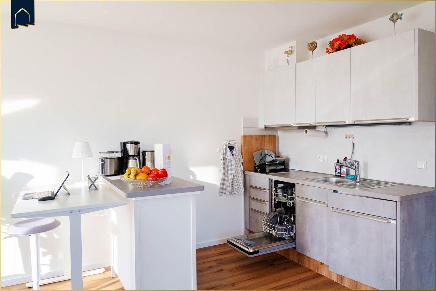 Die offene Küche ist vollständig eingerichtet und bietet alles, was das Kochherz begehrt: Cerankochfeld, Spülmaschine, Kühlschrank mit Gefrierfach, Kaffeemaschine, Wasserkocher, Toaster – und statt eines klassischen Backofens gibt’s hier ganz modern einen Airfryer, der Ihre Mahlzeiten in Windeseile knusprig zaubert. Im angrenzenden Essbereich genießen Sie Ihre Gerichte in gemütlicher Runde. Das Badezimmer überzeugt mit Dusche, Haartrockner und einem Kosmetikspiegel. Für kleine Gäste stehen Hochstuhl und Babybett kostenfrei bereit, Kinderbettwäsche kann für 9,90?€ hinzugebucht werden. Ein CD-Radio bringt auf Wunsch musikalische Retro-Vibes ins Urlaubsambiente.