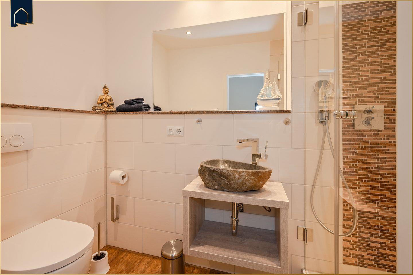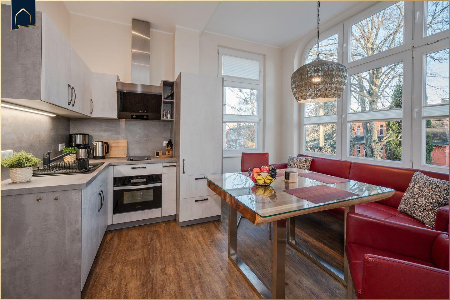 Im offenen Wohn- und Essbereich erwartet Sie eine wohnliche Atmosphäre. Der Wohnraum ist mit einem gemütlichen Sofa und zwei Fernsehern ausgestattet, sodass ein angenehmer Aufenthalt an Regentagen oder am Abend gewährleistet ist. Der Essbereich mit Esstisch ist offen in die modern ausgestattete Küche integriert. Hier finden Sie alles, was Sie für Ihren Aufenthalt benötigen: Herd, Mikrowelle, Kühlschrank mit Gefrierfach, Kaffeemaschine, Toaster, Wasserkocher sowie ausreichend Geschirr und Besteck. Auch ein Abfalleimer und ein Esstisch gehören selbstverständlich zur Ausstattung.