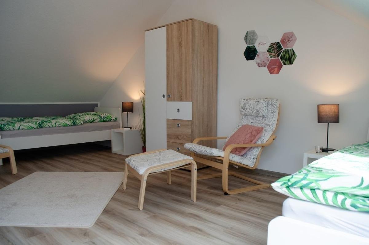 Im Erdgeschoss bietet die Ferienwohnung einen lichtdurchfluteten Wohn- und Essbereich mit einer vollständig ausgestatteten Küche sowie einer hochwertigen Wohnlandschaft mit Gästebettfunktion sowie einem Smart-TV und Amazon Echo. Weiter finden Sie im Erdgeschoss ein Schlafzimmer mit Doppelbetten (1,8 x 2 m). Das Badezimmer mit ebenerdiger Dusche und WC, einem Waschtrockner sowie einer Wickelmöglichkeit liegt dem Schlafzimmer gegenüber. Weiterhin gibt es noch einen Abstellraum unterhalb der Treppe.