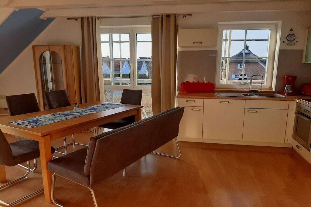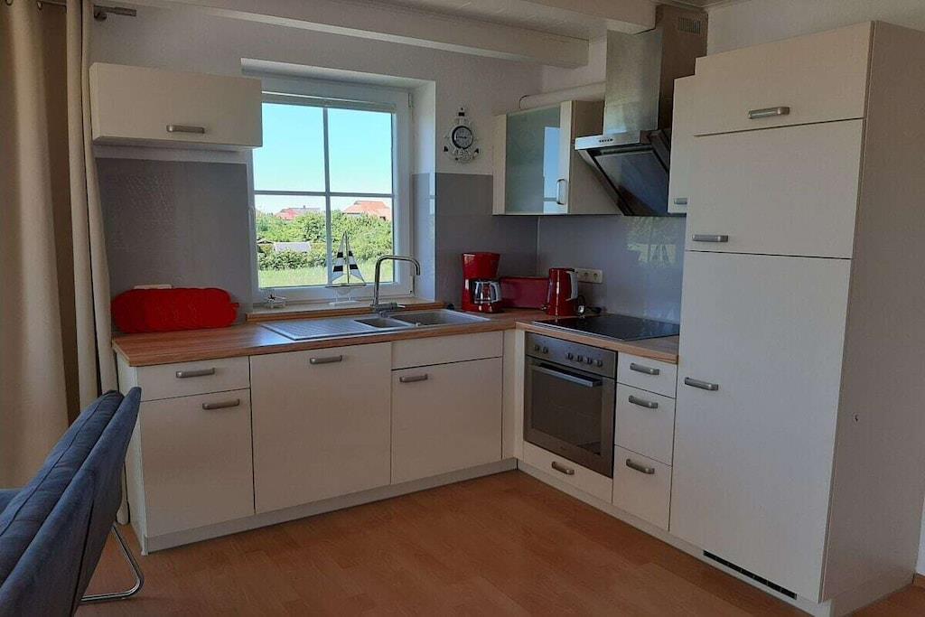 Unsere gemütliche und großzügig geschnittene Ferienwohnung befindet sich im Obergeschoß und besteht aus drei Schlafzimmern, einem modernen Badezimmer mit Wanne und Dusche, einem Gäste-WC sowie aus einer Wohnküche, in der Sie alles finden, was Sie für einen entspannten Urlaub benötigen. Von der lichtdurchfluteten Wohnküche sowie einem Schlafzimmer aus, können Sie den großen, sonnigen Balkon betreten und wunderschöne Sonnenuntergänge genießen. Den Naturstrand erreichen Sie zu Fuß nach etwa 800 Metern. Es wird keine Kurtaxe erhoben! Zudem gibt es auch zwei Hundestrände.