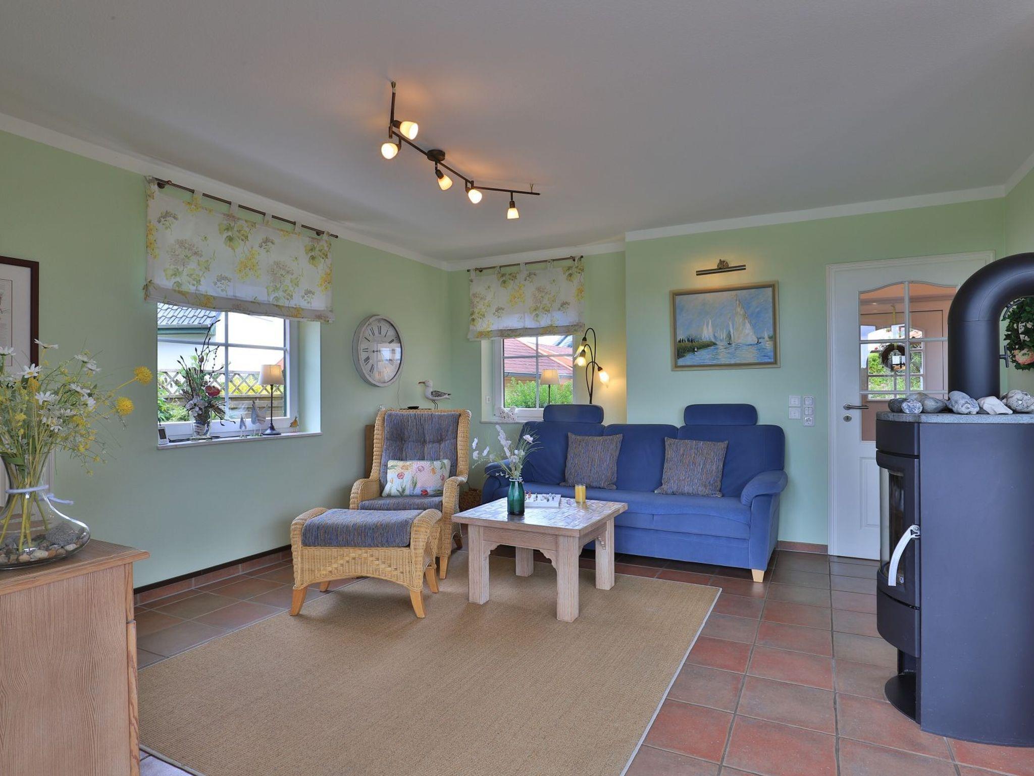 Im Erdgeschoss empfängt Sie der helle und komfortabel möblierte Wohn-Essbereich mit einem hochwertigen Sofa und einem Lehnsessel mit Beinablage. Auch ein Kaminofen lädt zur gemütlichen Auszeit ein. Am großen Esstisch mit Terrassenblick genießen Sie Ihre Mahlzeiten, die Sie in der bestens ausgestatteten Wohnküche zubereiten können. Ceranherd, Backofen, Mikrowelle, Dunstabzug, Kühlschrank mit integr. Gefrierfach, Kaffeemaschine, Wasserkocher, Toaster, Spülmaschine u.v.m. Für technische Unterhaltung stehen ein Fernseher, Musikanlage bereit und WLAN nutzen Sie ohne zusätzliche Gebühr. Auf der sonnigen Terrasse mit Strandkorb und angrenzenden Garten finden Sie Ruhe zum Entspannen. Zudem befindet sich im Erdgeschoss des Hauses ein Duschbad mit Waschtisch und WC. Über eine Treppe gelangen Sie in das Obergeschoss mit zwei Schlafzimmern und einem weiteren Badezimmer mit Wanne, Dusche, Waschtisch, Handtuchheizung, Föhn, WC. Beide Schlafzimmer sind mit einem Doppelbett, Kleiderschrank ausgestattet und bieten den Zugang zum Balkon mit Weitblick über die Felder. Für Kleinkinder stehen ein Kinderreisebett und ein Kinderhochstuhl bereit. Waschmaschine sowie Wäschetrockner, Bügeleisen und Bügelbrett befinden sich im Hauswirtschaftsraum. Das Haus lässt sich über Außenrollos verdunkeln. Mitgebrachte Fahrräder können im Abstellraum untergebracht werden. Ein kostenfreier Außenstellplatz gehört zum Ferienhaus.