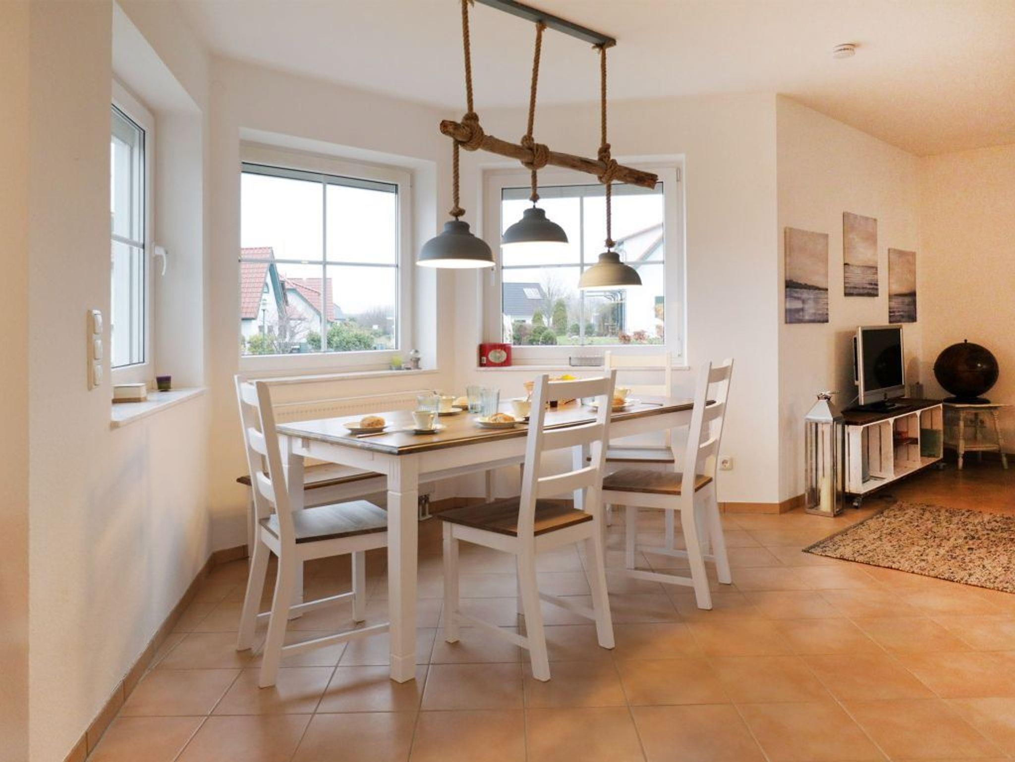 WLAN nutzen Sie kostenfrei. Die integrierte Küchenzeile ist sehr gut ausgestattet mit Geschirrspüler, Herd mit Backofen, Kühlschrank mit kleinem Gefrierfach, Kaffeemaschine, Wasserkocher usw. Auch eine Musikanlage, Fernsehgerät, sowie ein weiteres TV-Gerät in einem der Schlafzimmer sind vorhanden. Die sich im Obergeschoss befindenden Schlafbereiche sind zum einen mit einem Doppelbett und des Weiteren mit einem Etagenbett eingerichtet. Zudem besitzt das Obergeschoss ein sehr großzügiges Tageslicht Vollbad.