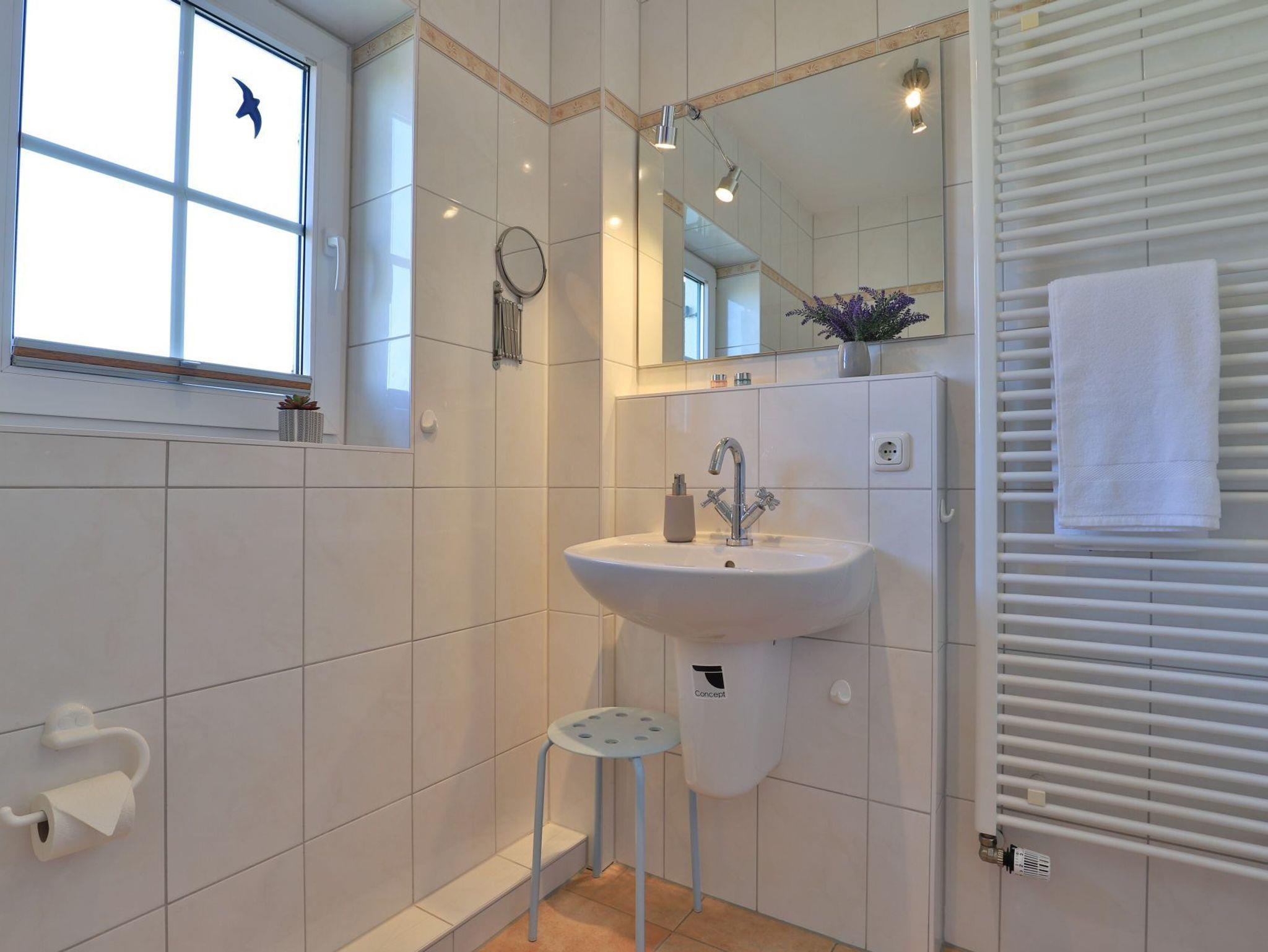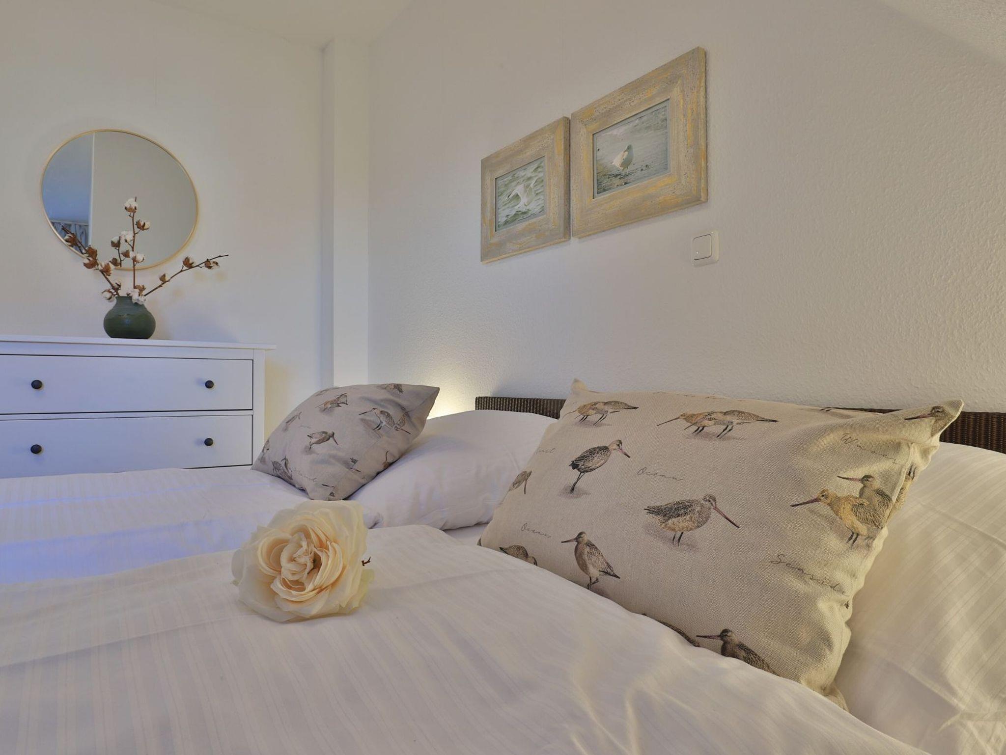 Im Erdgeschoss empfängt Sie der helle Wohn-Essbereich, welcher mit einer Sofalandschaft und Lesesessel modern und stilvoll möbliert ist zudem einen schönen Blick auf Terrasse und Garten ermöglicht. Fernseher sowie Musikanlage und kostenfreies WLAN sind ebenfalls vorhanden. Ideal für die Eigenversorgung ist eine offene Wohnküche integriert mit: Ceranherd, Backofen, Dunstabzug, Kühlschrank mit integriertem Gefrierfach, Kaffeemaschine, Wasserkocher, Toaster, Spülmaschine usw. Ihre Urlaubsmahlzeiten können Sie am Esstisch zu sich nehmen oder Sie nutzen die saisonal möblierte Süd-West Terrasse mit anbrandendem Garten. Auch ein Gäste-WC ist im Erdgeschoss vorhanden. Im Hauseingangsflur befindet sich eine schöne Treppe, über die Sie in das Obergeschoss mit zwei Schlafzimmern und Duschbad gelangen. Eines der Schlafzimmer ist mit Doppelbett, Kleiderschrank und Ruhesessel mit Beinablage eingerichtet. Das zweite Schlafzimmer verfügt über ein Doppelbett, Kommode. Das Tageslicht Duschbad ist mit Waschtisch, Handtuchheizung, Föhn, WC ausgestattet. Für Kleinkinder stehen ein Kinderreisebett und ein Kinderhochstuhl bereit. Ein kostenfreier Außenstellplatz gehört zum Ferienhaus.