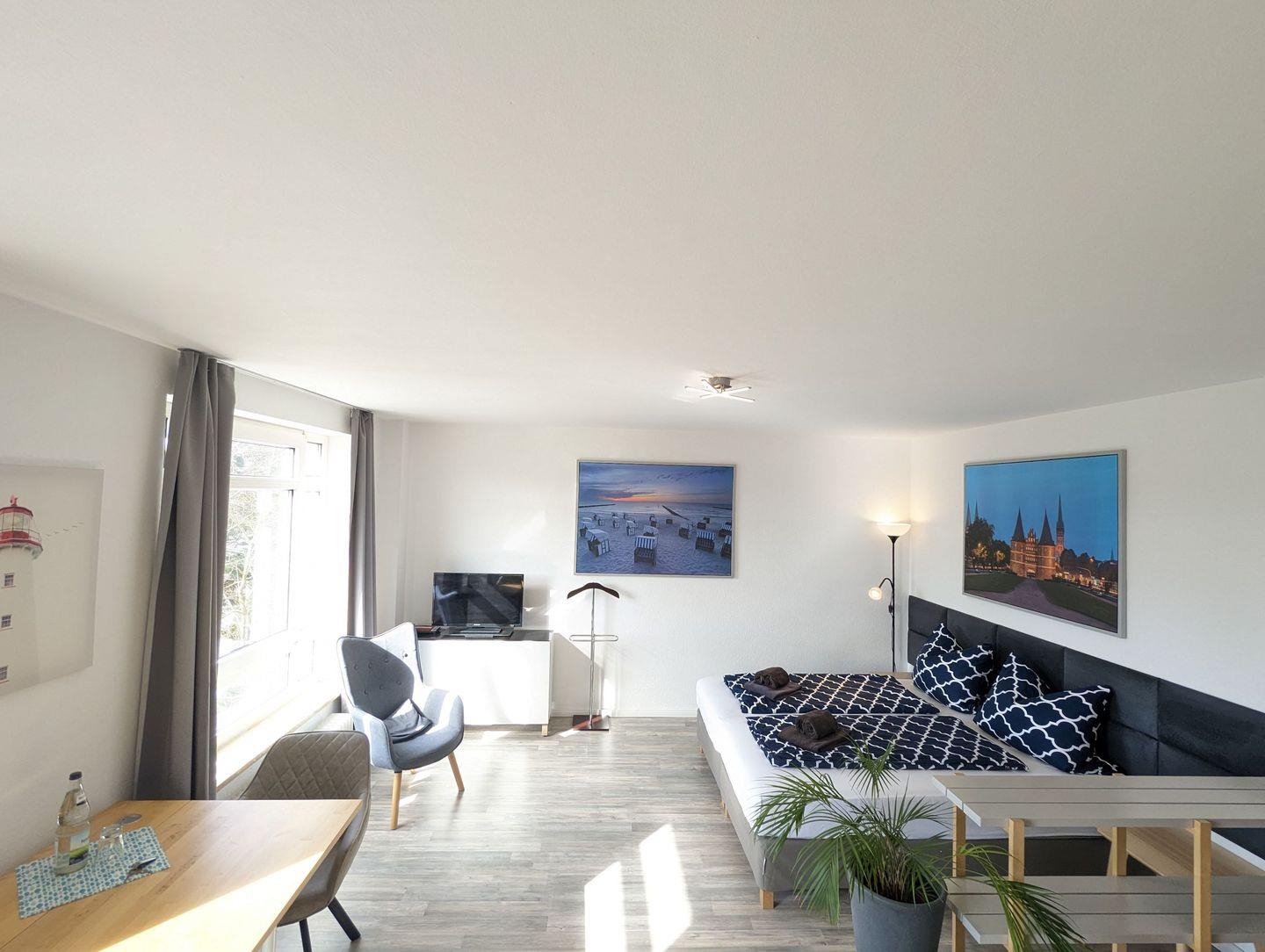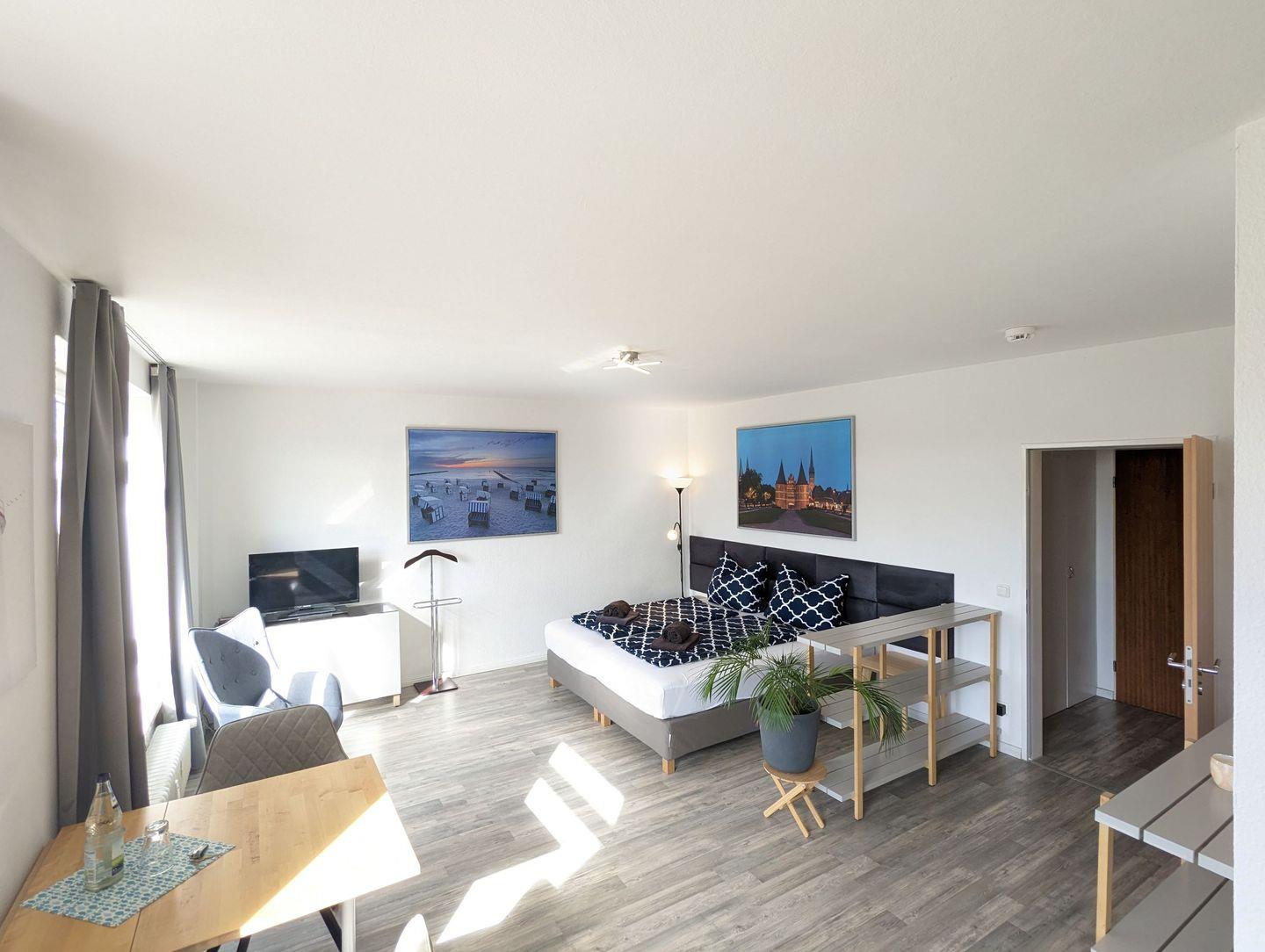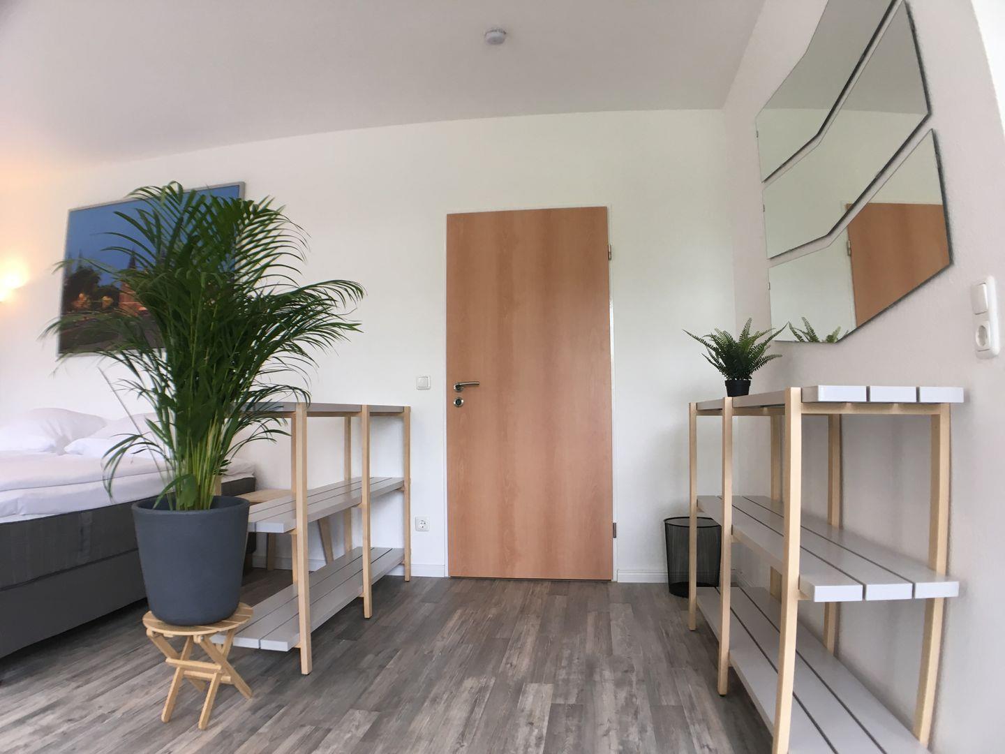 Das Apartment besteht aus einem kleinen Eingangsbereich/Flur mit Einbauschrank, welcher viel Stauraum für Kleidung und Koffer bietet. Vom Flur gelangt man in das kleine Bad, welches mit Dusche und WC ausgestattet ist. Der Wohn/Schlafbereich ist mit einem Doppel-Boxspringbett (180x200) oder 2 Einzelbetten (je 90x200), TV, Schreib- bzw. Esstisch und reichlich Stauraum ausgestattet.