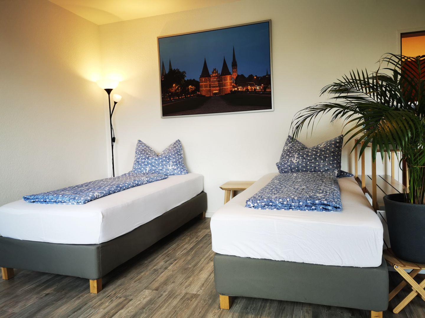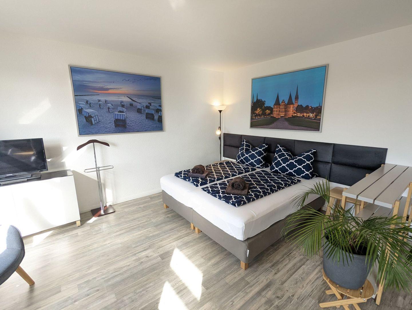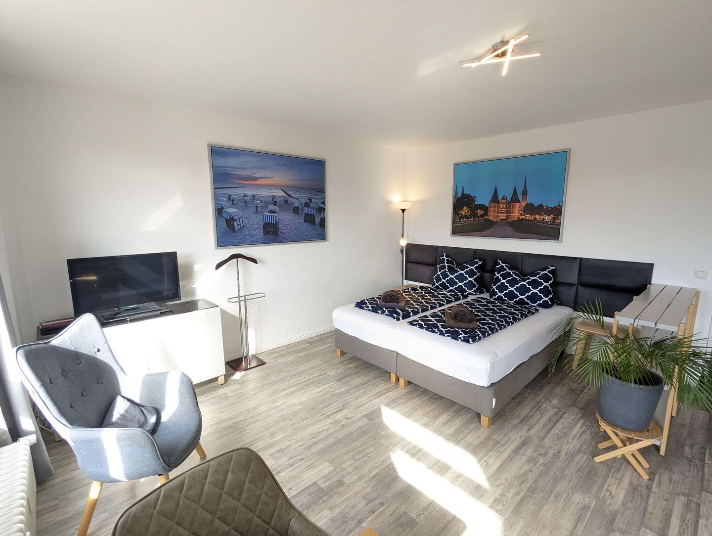 Das Apartment besteht aus einem kleinen Eingangsbereich/Flur mit Einbauschrank, welcher viel Stauraum für Kleidung und Koffer bietet. Vom Flur gelangt man in das kleine Bad, welches mit Dusche und WC ausgestattet ist. Der Wohn/Schlafbereich ist mit einem Doppel-Boxspringbett (180x200) oder 2 Einzelbetten (je 90x200), TV, Schreib- bzw. Esstisch und reichlich Stauraum ausgestattet.