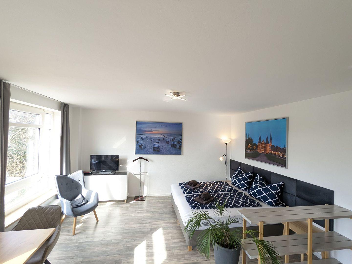 34m² Apartment mit modernem Wohn- und Schlafbereich für 1-2 Personen, voll eingerichteter Küche und Badezimmer mit Dusche. WLAN kostenfrei