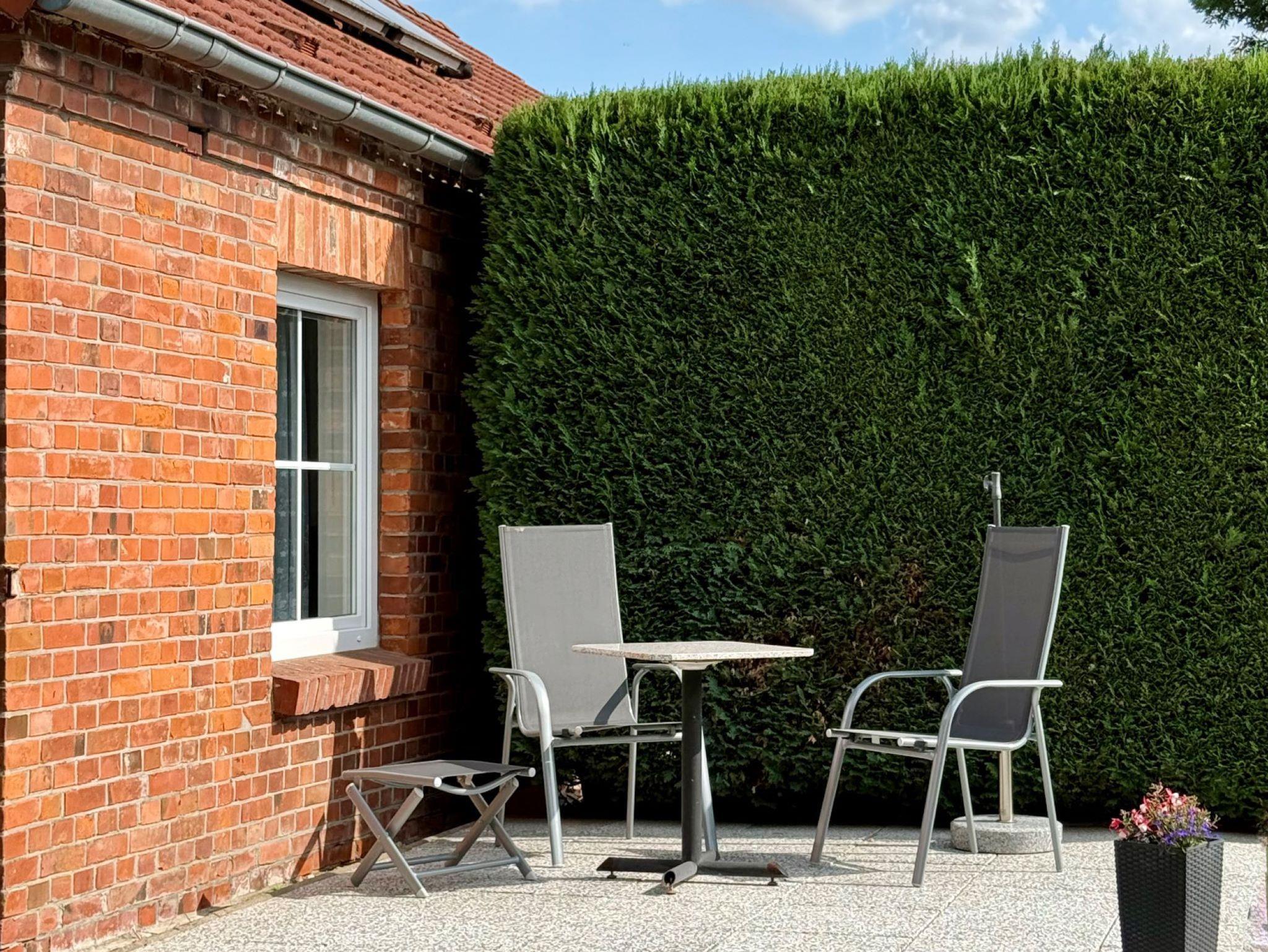 Zur Ferienwohnung gehört weiterhin eine Terrasse mit Gartenmöbeln und Grill sowie eine Liegewiese.