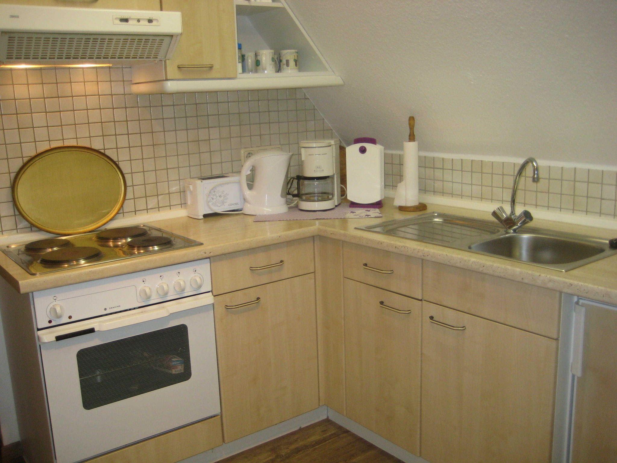 • 2. Küche als offene Küchenzeile mit vollständiger Ausstattung, Herd mit Backofen. Selbstverständlich sind Kleingeräte wie Kaffeemaschine, Wasserkocher und Toaster vorhanden.