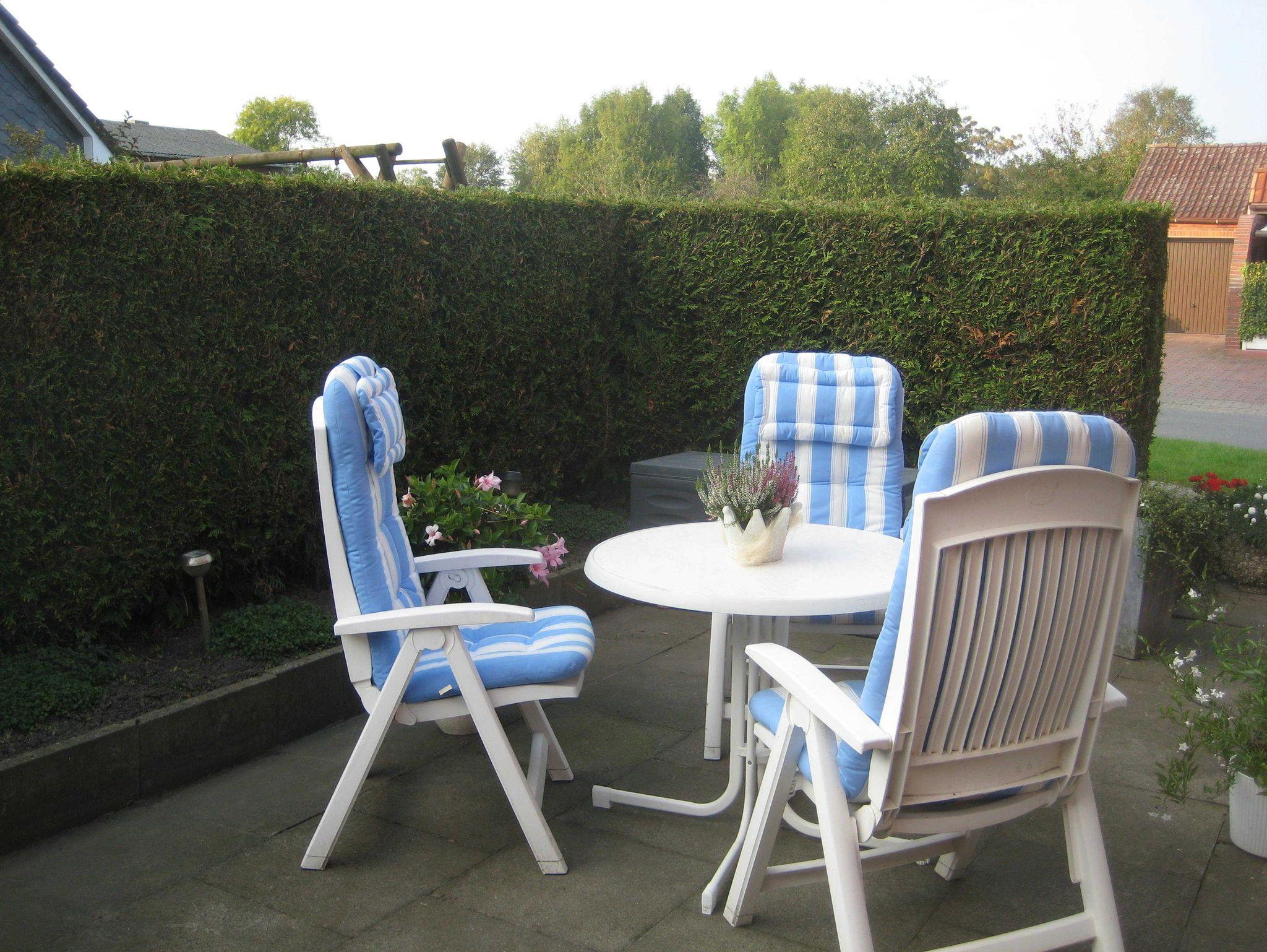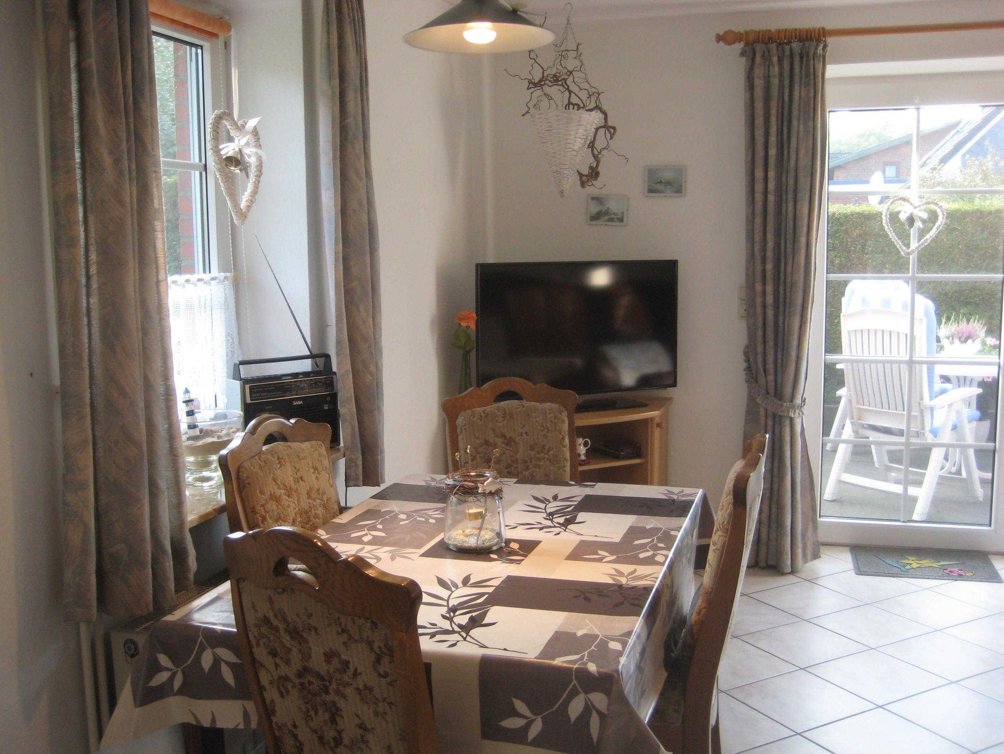 • Wohnzimmer mit Essecke, Radio und SAT-TV vorhanden. Eine große Schiebetür führt direkt auf die mit einer Hecke eingefasste eigene Terrasse.