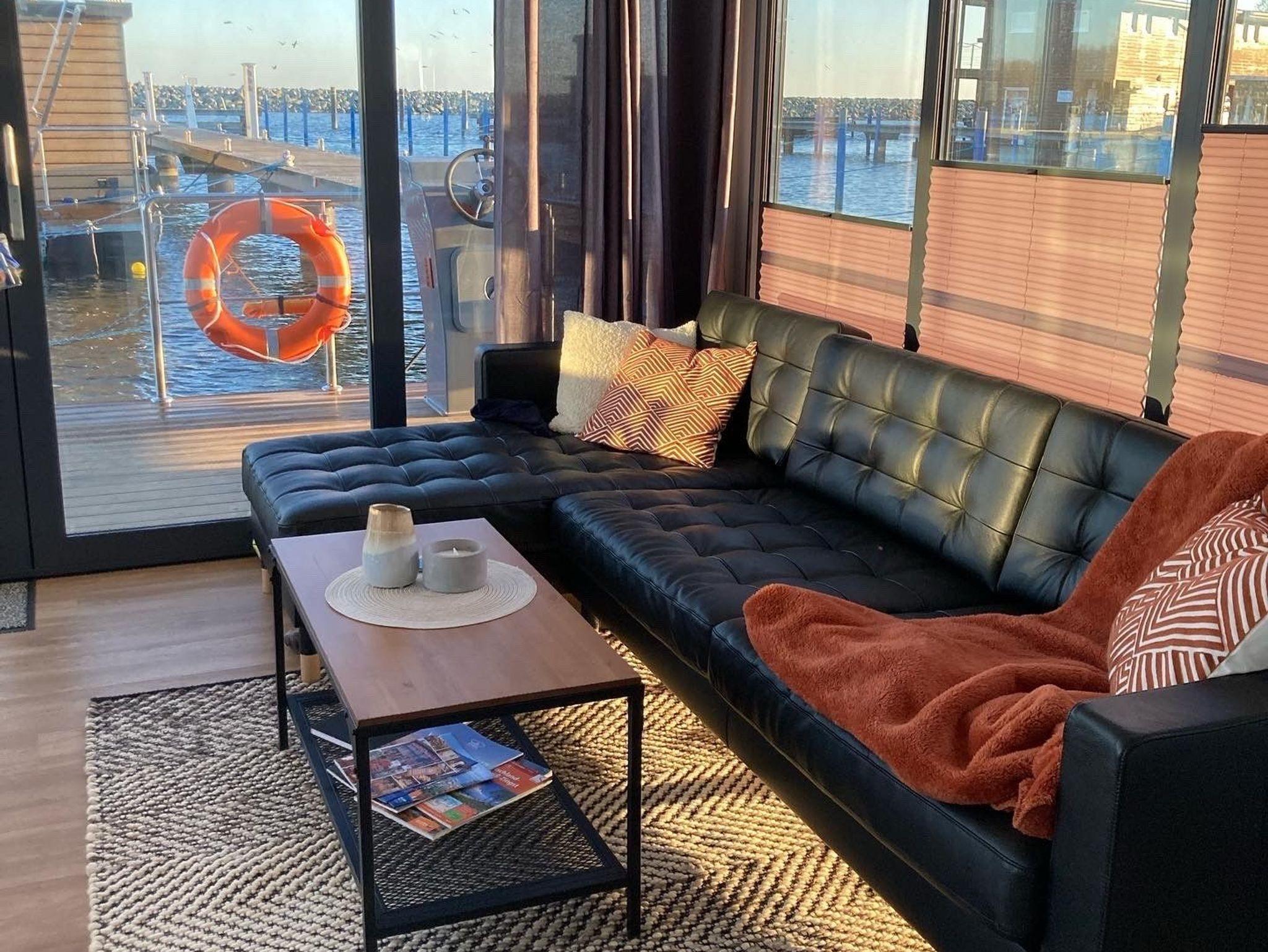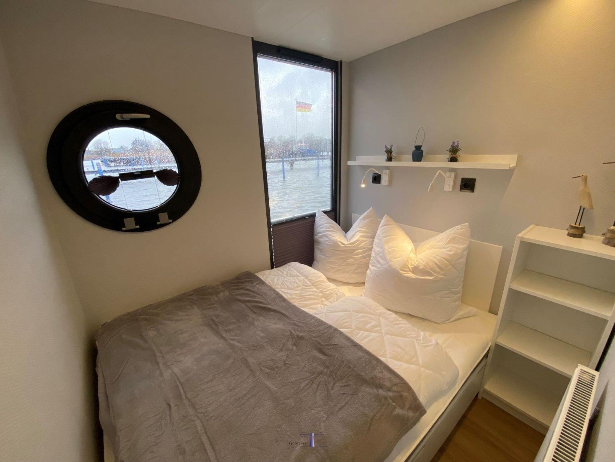 Im Inneren des Hausbootes finden Sie neben dem Wohnraum mit Fußbodenheizung für kalte Tage zwei Schlafräume mit je einem Doppelbett sowie ein modernes Duschbad. Genügend Stauraum finden Sie in den Schränken sowie in den Schubladen unter den Betten.