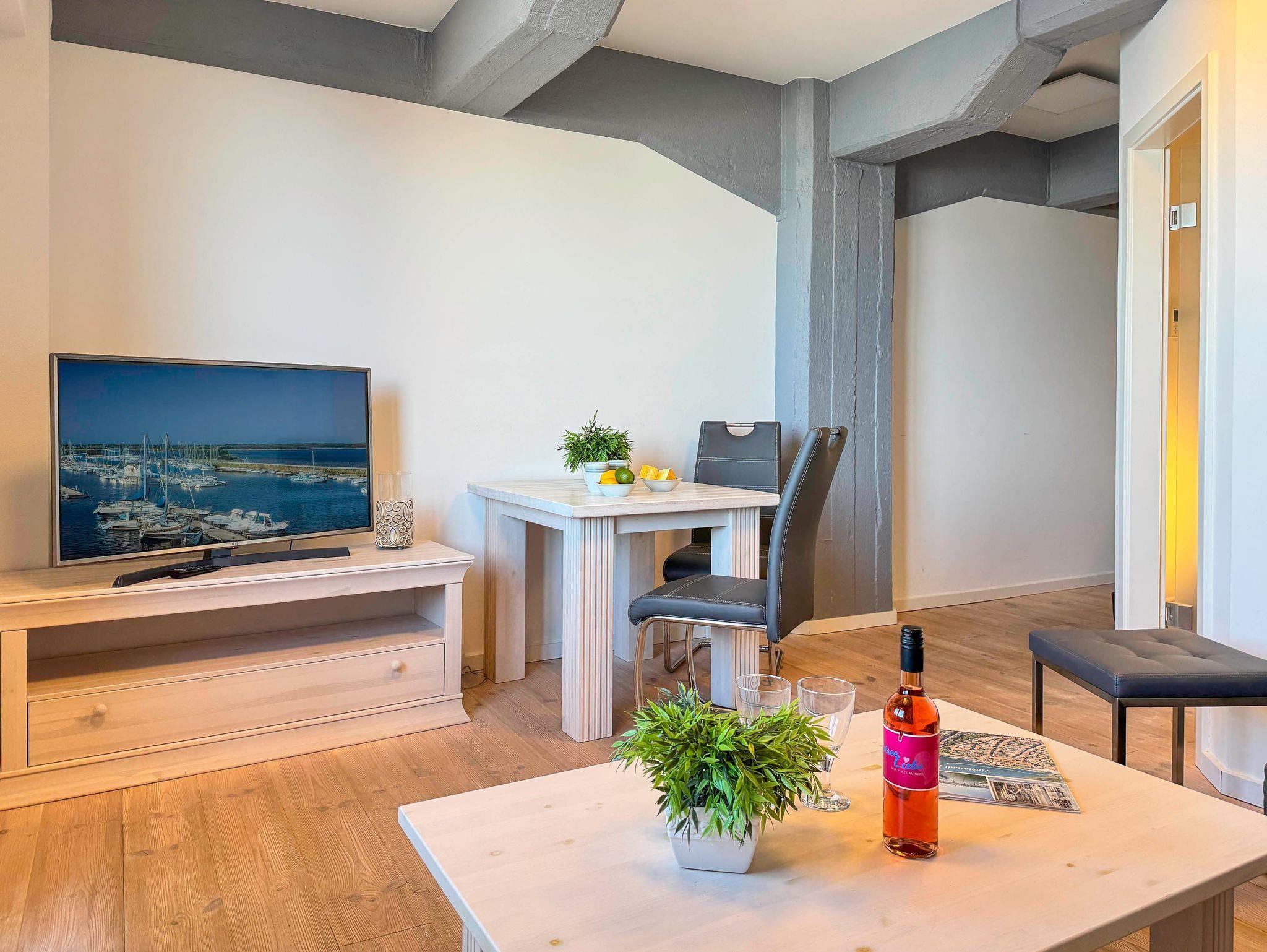 Die Speicherresidenz App. 3.4 empfängt Sie mit einer einladenden Atmosphäre. Der Wohnbereich mit Schlafcouch und Essplatz lädt zu gemütlichen Abenden ein. In der voll ausgestatteten Küchenzeile können Sie Ihre Lieblingsgerichte zubereiten, die Sie anschließend auf dem Balkon mit Wasserblick genießen können. Das separate Schlafzimmer bietet komfortable Ruhe, während das moderne Badezimmer mit Dusche zusätzlichen Komfort bietet.