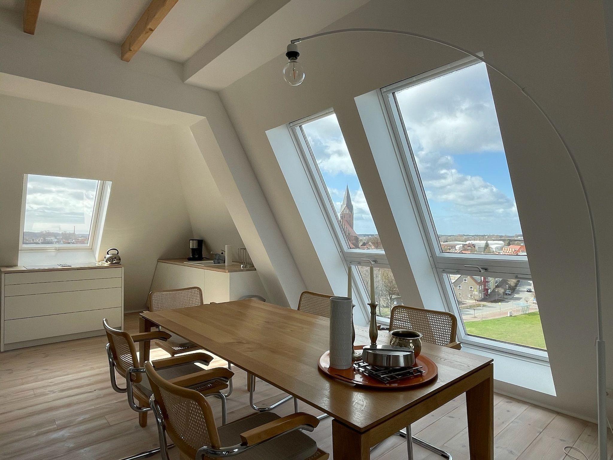 Die Renovierung des denkmalgeschützten Speichers wurde 2021 abgeschlossen. Mit einem Aufzug erreichen Sie die Maisonette-Wohnung, die sich über zwei Ebenen erstreckt und Ihnen eine hochwertige, designorientierte Ausstattung bietet:
