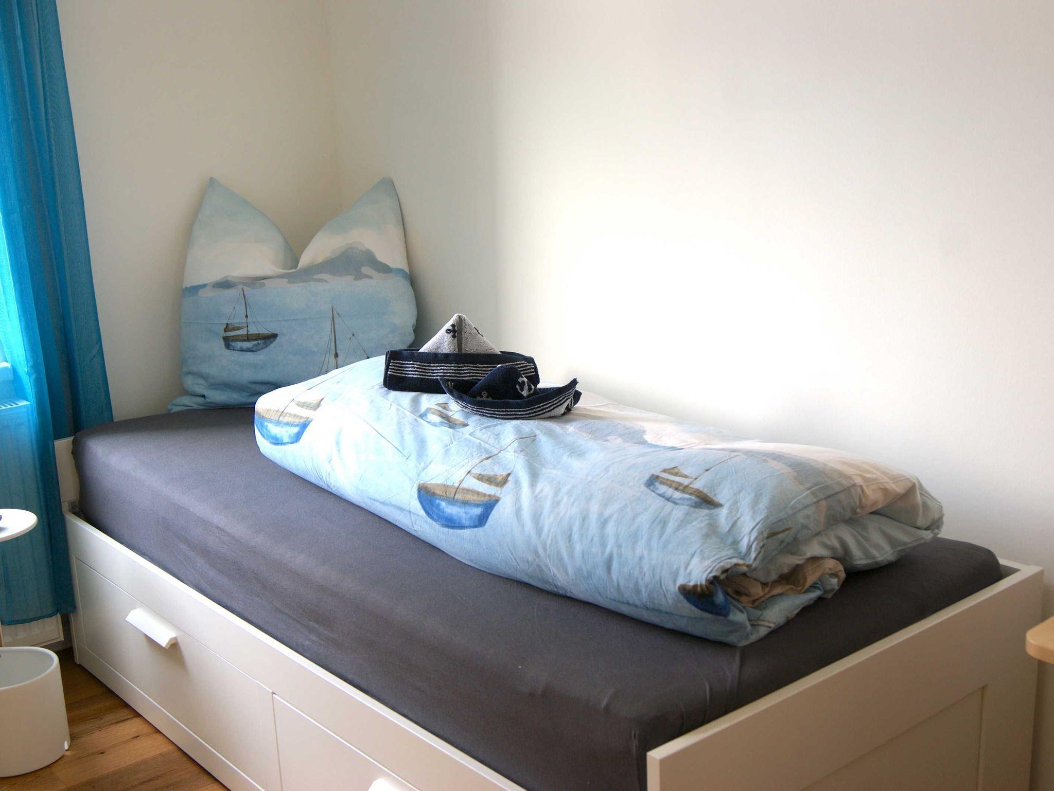 Gesellschaftsspiele, Krimis und Romane liegen bereit. Im Hauptschlafzimmer befindet sich ein 1,80 x 2,00 m großes Boxspringbett und ein begehbarer Kleiderschrank, sowie ein Bügelbrett und Bügeleisen. Im zweiten Schlafzimmer befindet sich ein 0,90 x 2,00 m Bett, welches optional zu einem 1,80 x 2,00 m Doppelbett ausziehbar ist, sowie ein Kleiderschrank und ein kleiner Schreibtisch mit Stuhl. Alternativ kann das dort vorhandene Schlafsofa als zweites Bett genutzt werden. Im Wohnzimmer befindet sich neben dem großen L-förmigen Sofa, auch ein Ohrensessel mit Beinhocker. Das Tageslichtbad ist ausgestattet mit einer 0,86 x 1,30 m großen Dusche mit niedriger Einstiegshöhe und Handtuchheizkörper. Außerdem befindet sich dort auch ein WC, sowie ein großer Waschtisch mit Spiegel und Föhn. Die einzelnen Räume sind über den zentralen Wohnungsflur erreichbar. Die gesamte Wohnung ist (außer Bad) mit einem hellen Parkettboden ausgestattet und eine Nichtraucherwohnung. Die Wohnräume sind nach Westen ausgerichtet und verfügen über sehr viel Tageslicht.