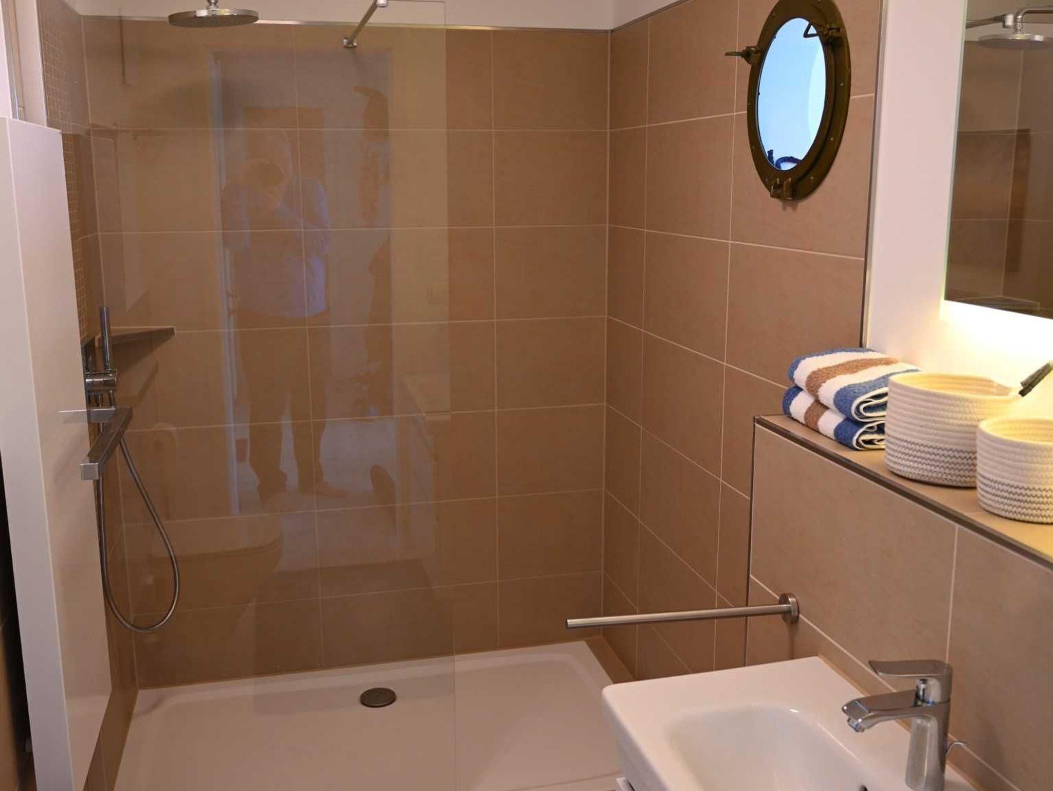 Es erwartet Sie eine offene Einbauküche im Wohnbereich mit Komplettausstattung und ein Badezimmer mit großer Dusche.