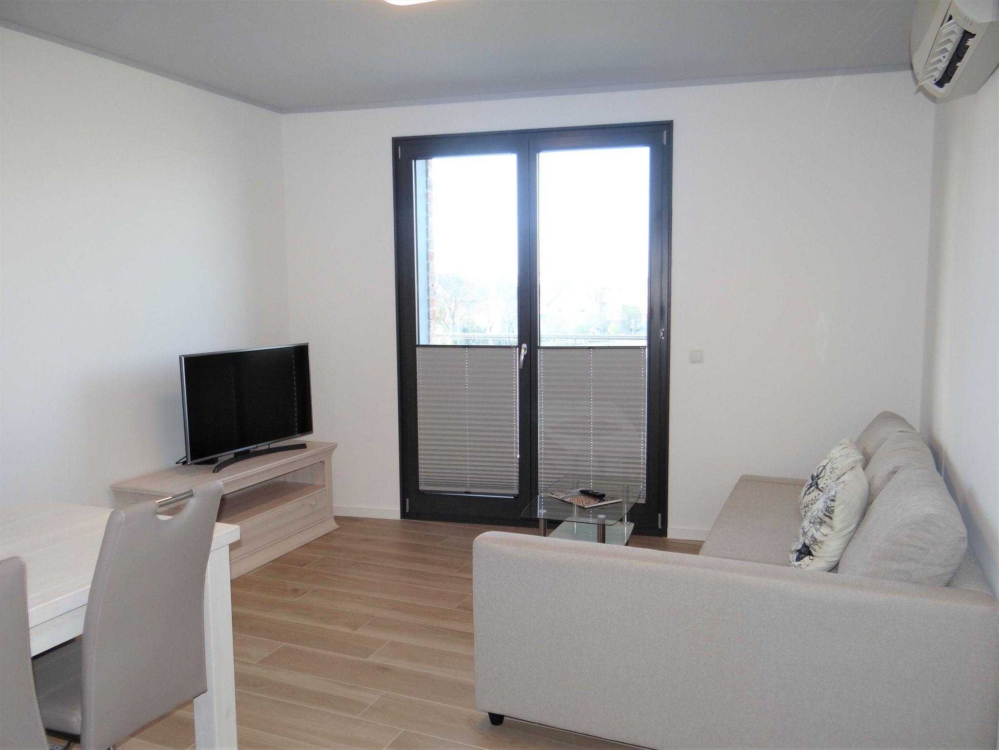 Schlafzimmer mit Boddenblick, Wohnzimmer mit Balkon, Esstisch mit Durchreiche zur offenen Einbauküche mit hochwertiger Küchenausstattung; Kaffeeautomat (Bohnen und Pulver), Backofen inkl. Mikrowelle und Grillfunktion, Geschirrspüler. Bad mit großer ebenerdiger Dusche, Klimaanlage,