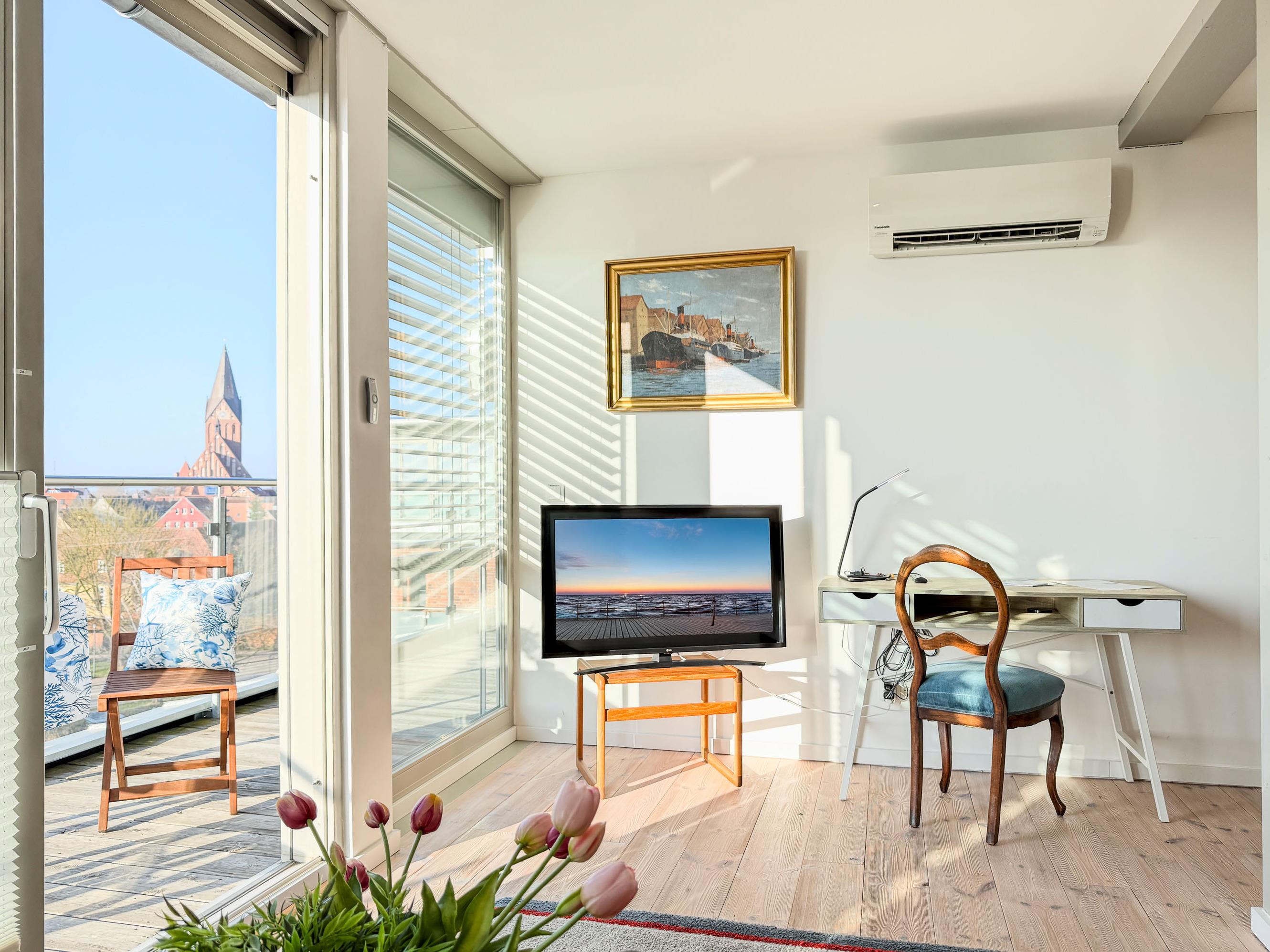Die Speicherresidenz App. 5.11 empfängt Sie mit einer einladenden Atmosphäre. Der gemütliche Wohnbereich mit Schlafsofa und Sitzgruppe lädt zu entspannten Abenden ein. In der voll ausgestatteten Küchenzeile können Sie Ihre Lieblingsgerichte zubereiten und diese anschließend auf dem Südbalkon genießen. Das separate Schlafzimmer bietet erholsamen Schlafkomfort, während das moderne Badezimmer mit ebenerdiger Regendusche zusätzlichen Komfort bietet.