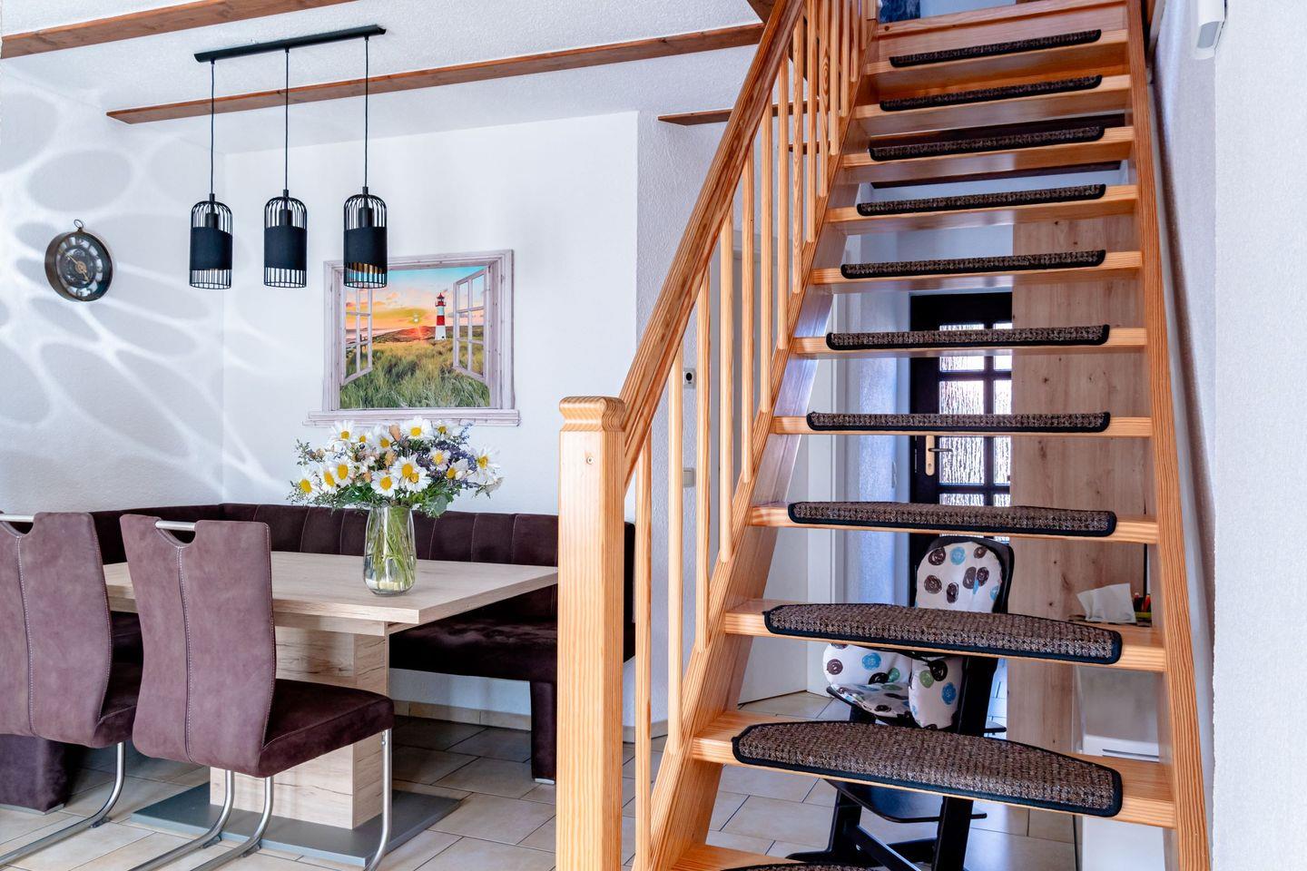 Wegen der Treppen sind auch 2 Treppenschutzgitter vor Ort (im Schuppen), die man ganz einfach in vorhandene Vorrichtungen an der Treppe einhängen kann. Damit ist sichergestellt, dass Kleinkinder auf der 1. Ebene (Wohnzimmer, Schlafecke) weder die Treppe ins EG herunterfallen, noch die Treppe ins DG heraufklettern können.