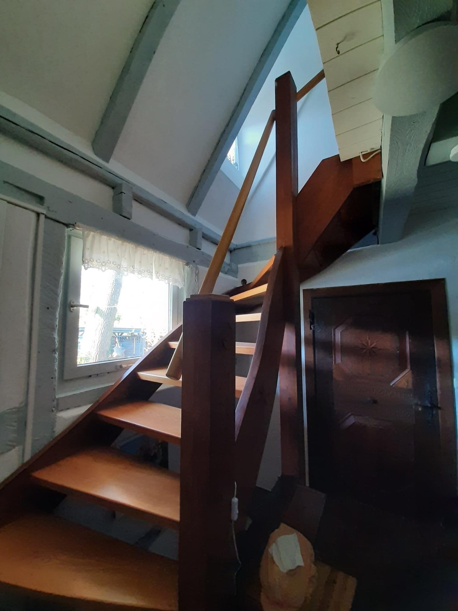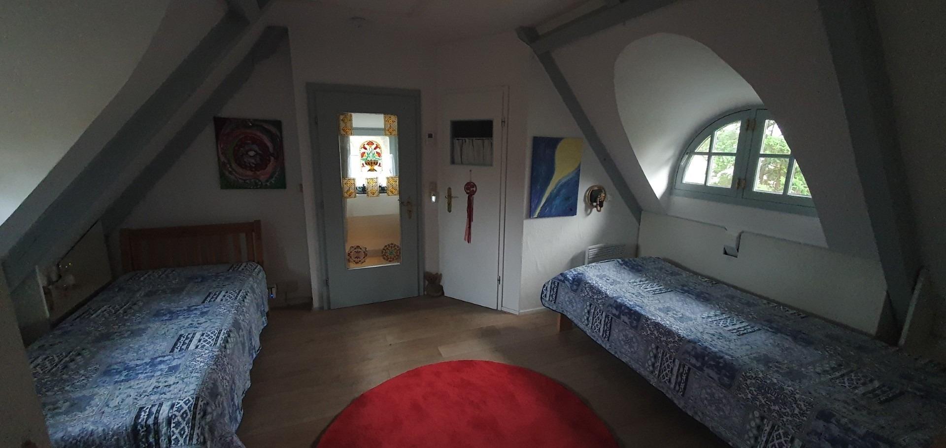 Im 1. Stock gelangt man durch einen Raum mit 2 Einzelbetten in ein lichtdurchflutetes großes Schlafzimmer mit einem Doppelbett (Hülsta). Weiter befindet sich im 1. Stock das 2. Bad.